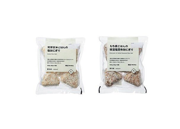 「もち麦ごはんの枝豆塩昆布おにぎり」、「発芽玄米ごはんの塩おにぎり」(各80g×5個)各¥490