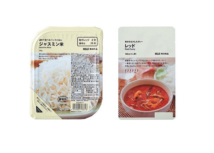 「素材を生かしたカレー レッド」¥350、「温めて食べるパックごはん ジャスミン米」¥290
