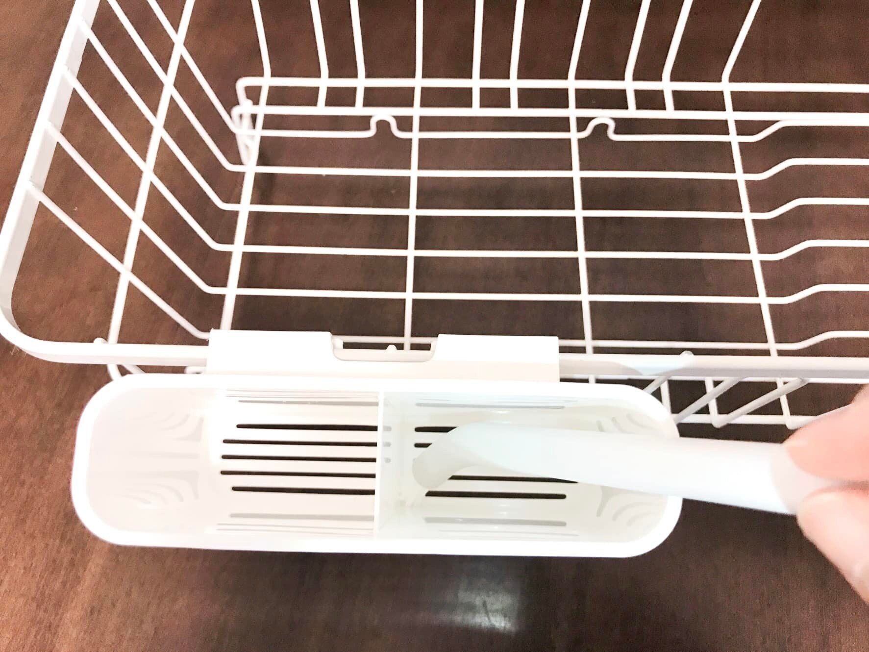 水切りラックのカトラリーポケットの底は、歯ブラシでも掃除しにくいけれど、このポイントブラシなら届きにくい箇所にしっかりと毛先が届いてくれます。