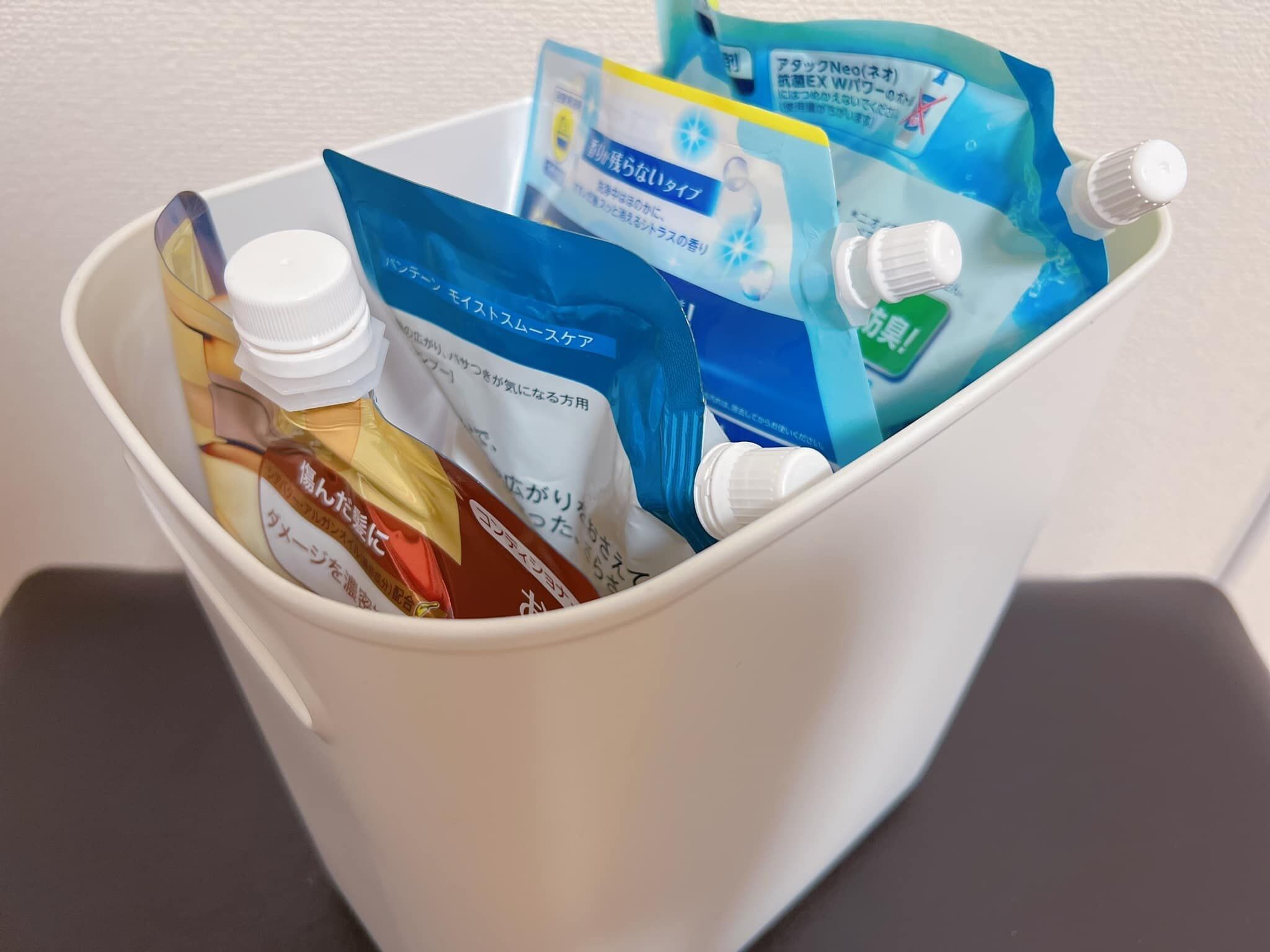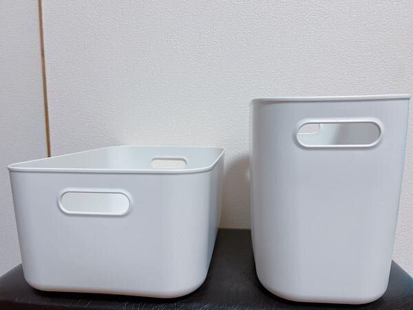 わが家でどう活躍しているかというと、たとえば洗面台下の収納では、少し高さがあるシャンプーや洗剤などの消耗品ストック入れにぴったり。