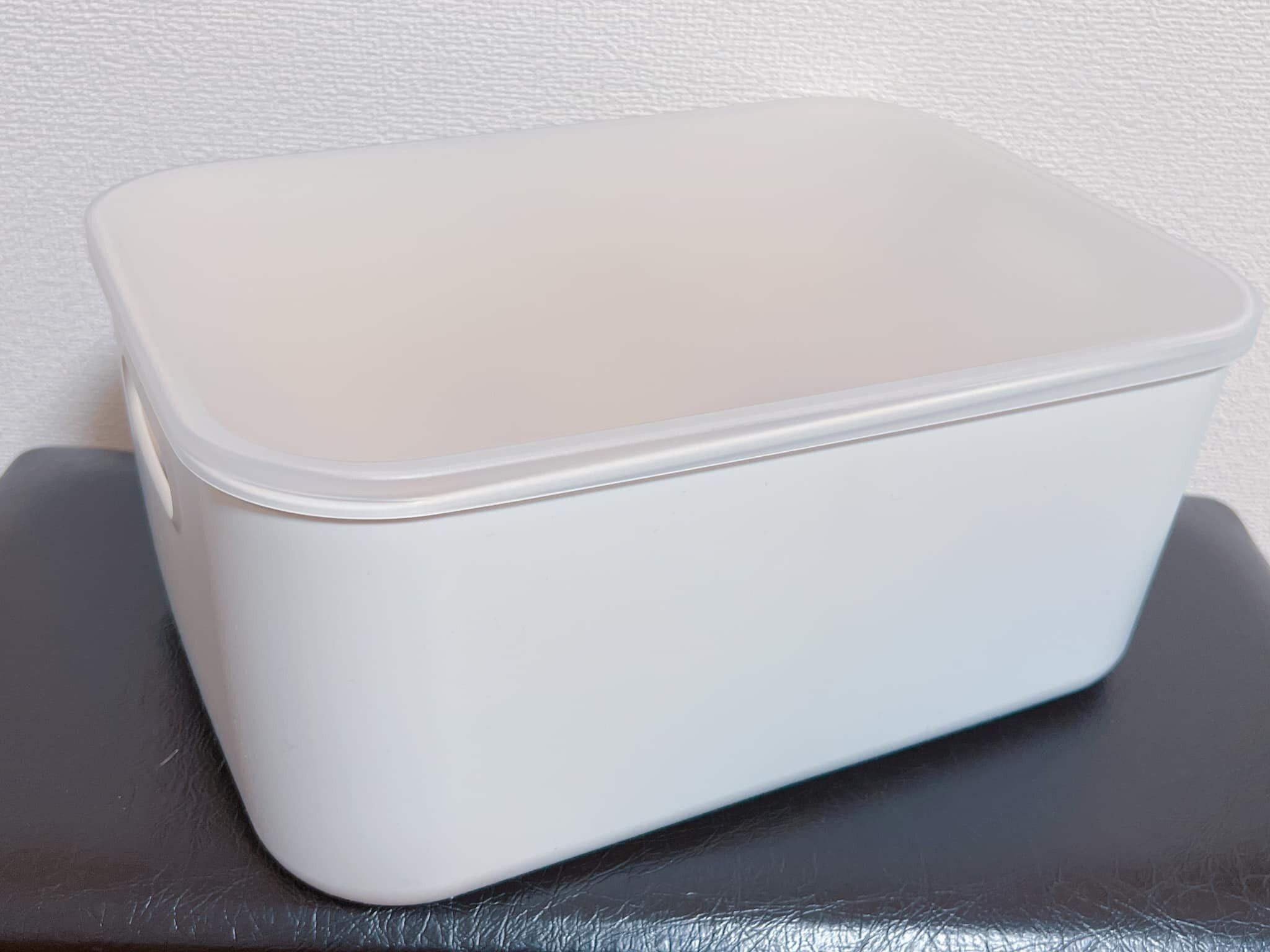 別売りのフタを使えば重ね置きも可能。半透明なので中身も確認しやすいですよ。こちらのフタは「やわらかポリエチレンケース用フタ」という商品名で、サイズは約幅26×奥行36.5×高さ1.5cm、価格は290円となっています。