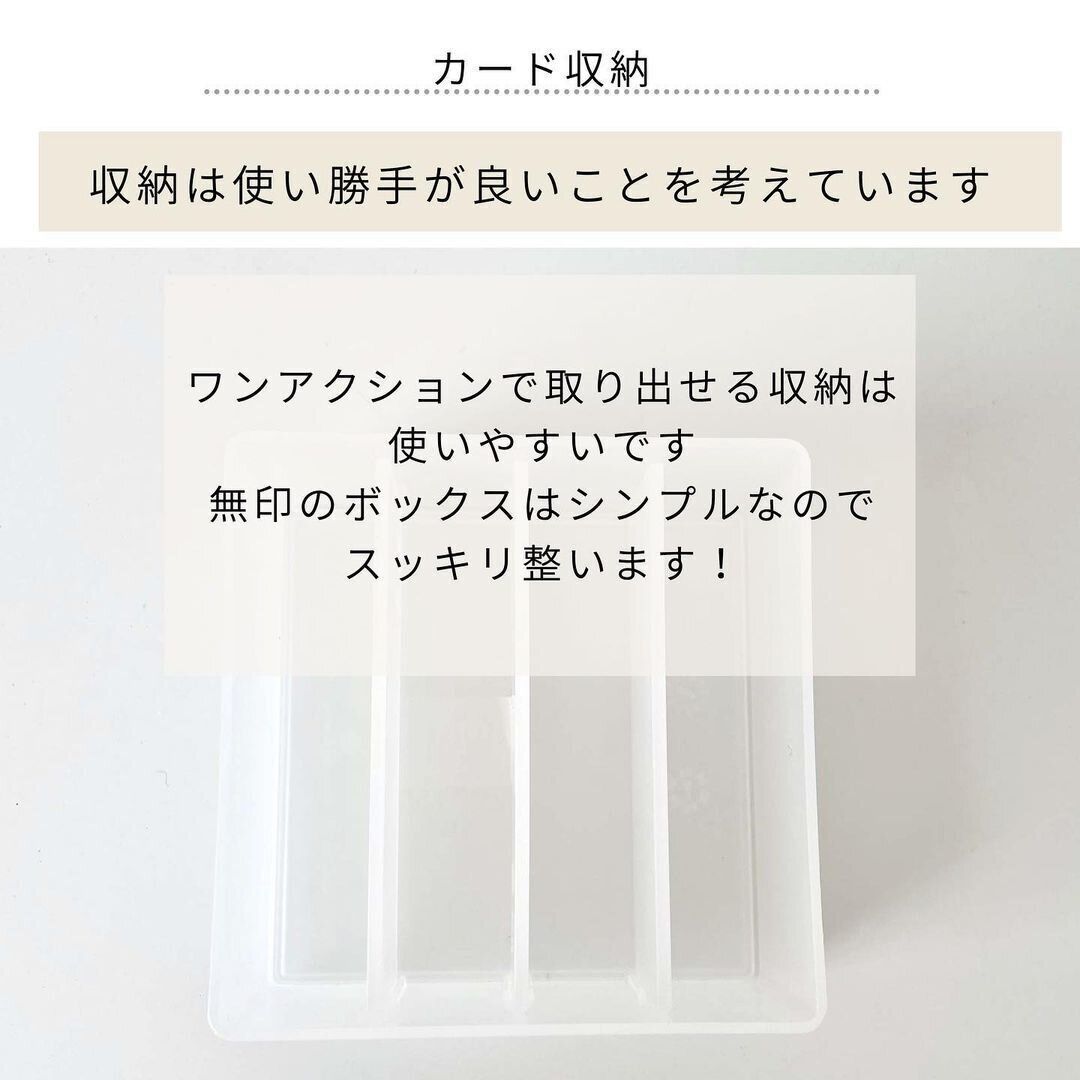 家で保管しているカード類。置き場所を決めておかないと、いろんなところに散らばって探すのに苦労することも多いですよね。カードの収納には、無印のポリプロピレンデスク内整理トレー1(120円)が便利です。クレジットカードと同型のカードがピッタリ収まる幅なので、すっきりとケースにしまうことができます。別売りの仕切り板(3枚セット、100円)でカードの種類をこまかく分けるなど、自分の使いやすいようにカスタマイズするのもおすすめです。