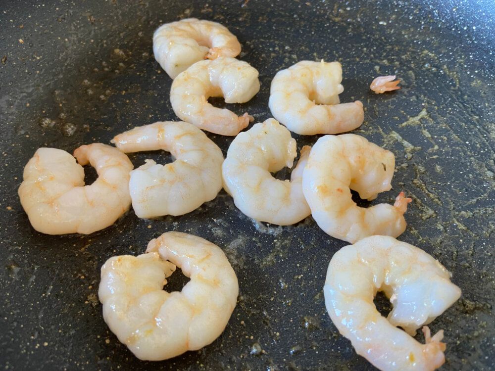 塩水解凍して水気をしっかり拭き取ったえびを加熱調理します。フライパンにオリーブオイルをひいてさっと炒めたえびはそのままでとってもおいしい!塩味がほどよくついていて、身はぷりっとしています。