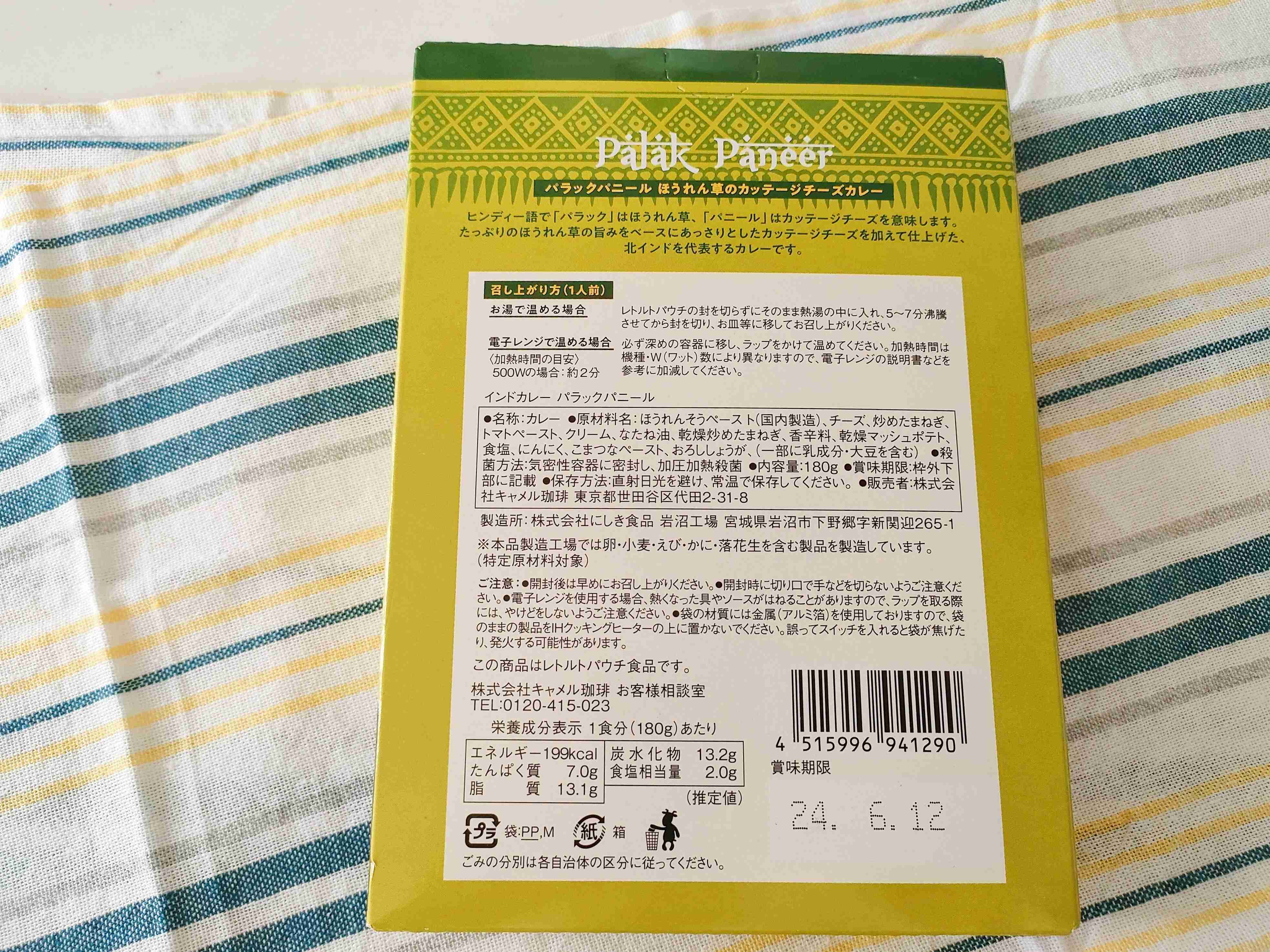 ほうれん草ベースなので、野菜のおいしさがぎゅっと詰まった味になっています。ブロックになったチーズがごろっとはいっていたのには驚きましたが、ルーにきちんとマッチしています。