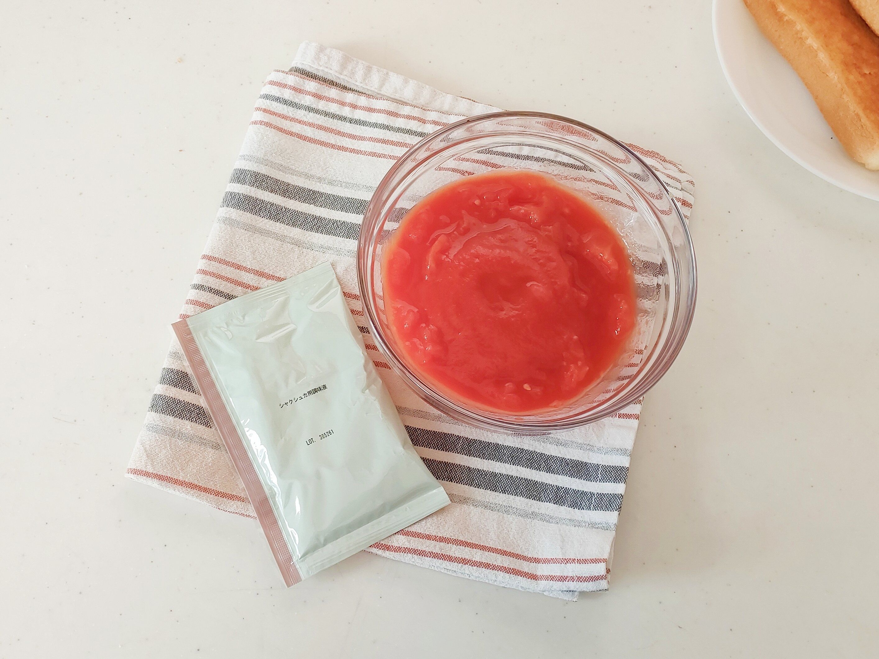 今回は、食パンをカリカリに焼いたものを使いましたが、これがとても合います。固めのバゲットがソースとの相性がよさそうです。