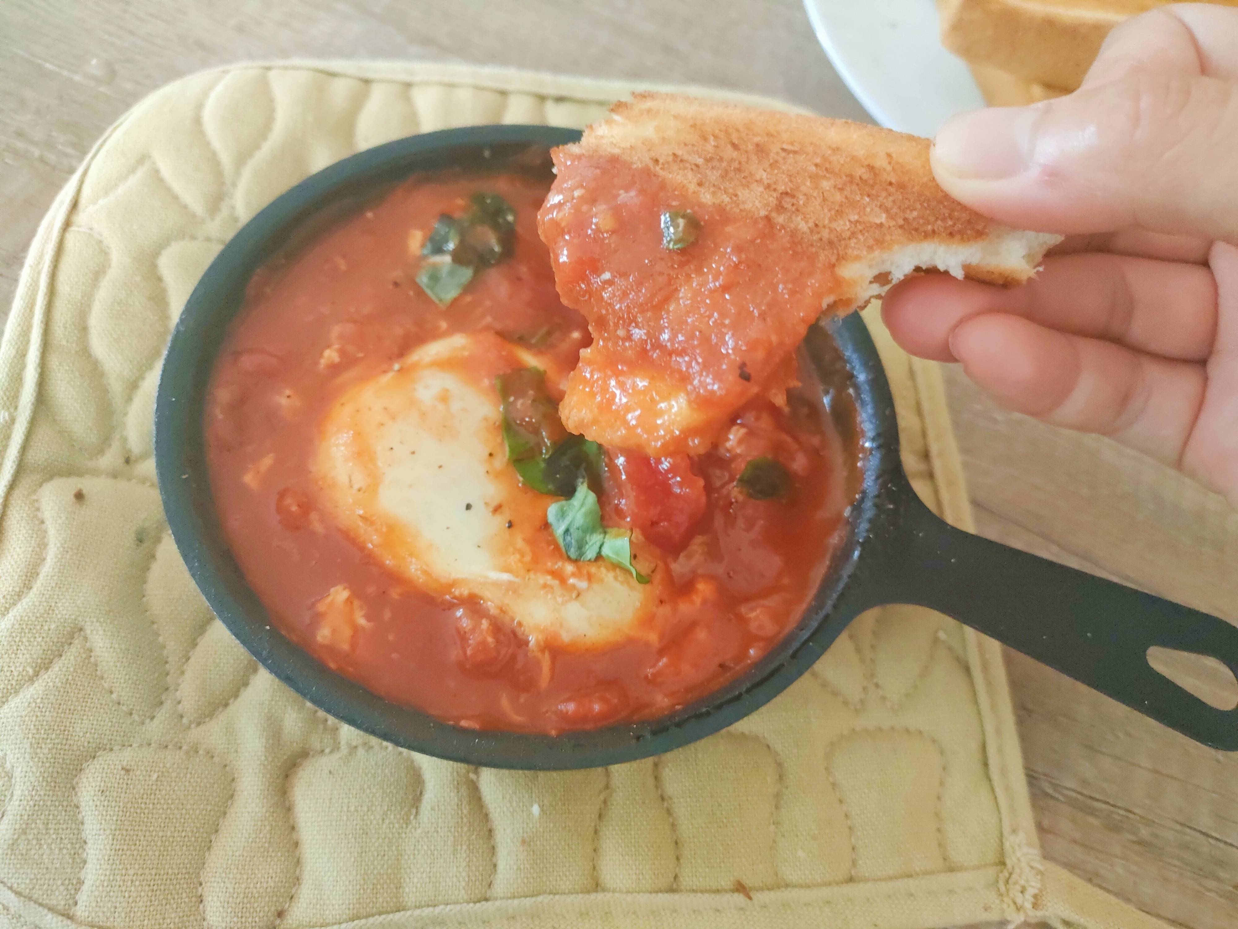 まず、小鍋にトマト缶と素を混ぜて火にかけます。ある程度グツグツしてきたら、そっと卵を割りフタをします。卵に火がとおればできあがり!