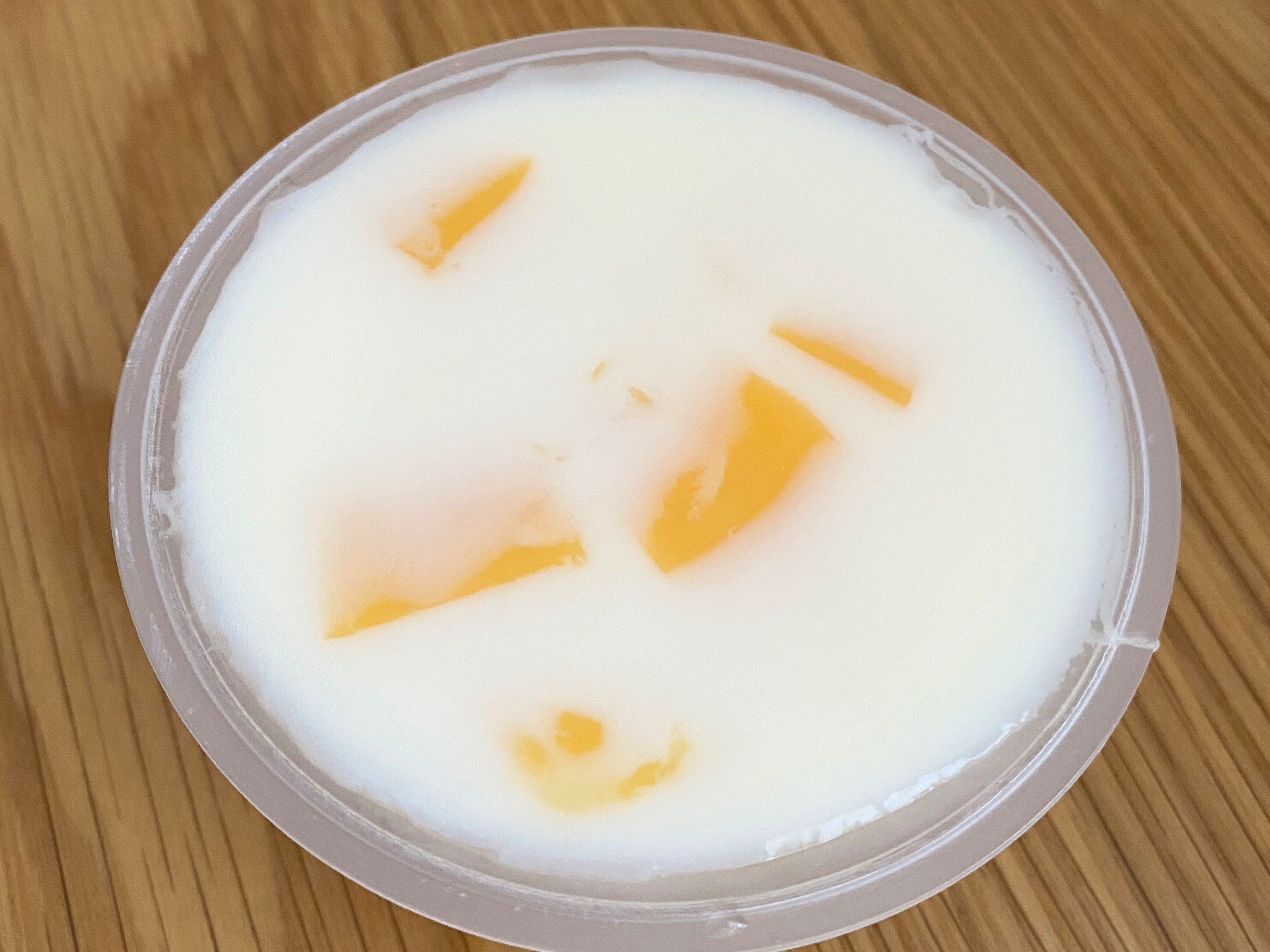 一口サイズのマンゴープリンを杏仁豆腐で包み込むようにカップに入っています。