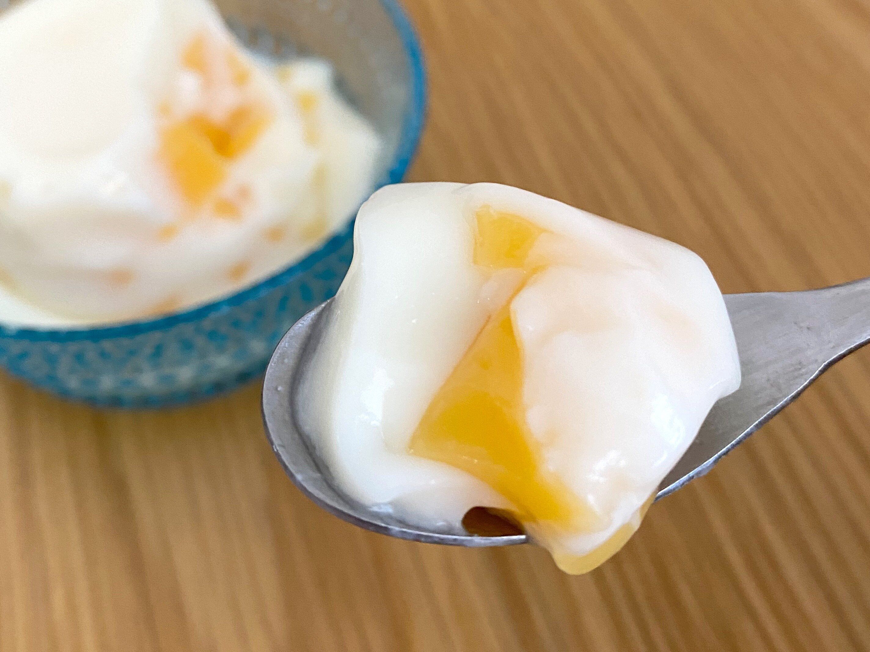 スプーンを入れてみるとまわりの杏仁豆腐は柔らかく、中のマンゴープリンは弾力があることがわかります。
