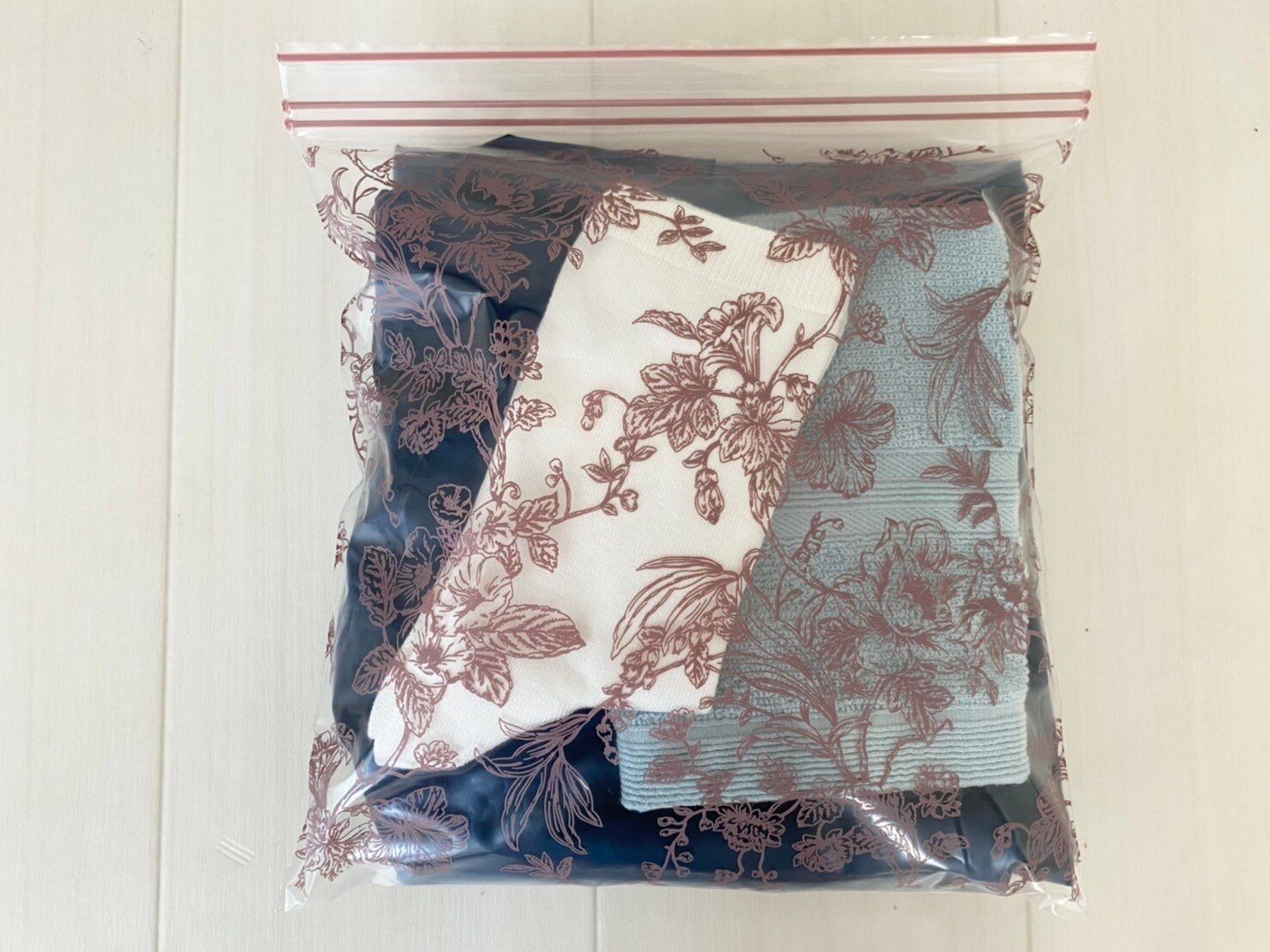 ダブルジッパーできちんと密閉する冷凍もOKなジッパーバッグです。大人っぽい花柄に惹かれて購入しました。