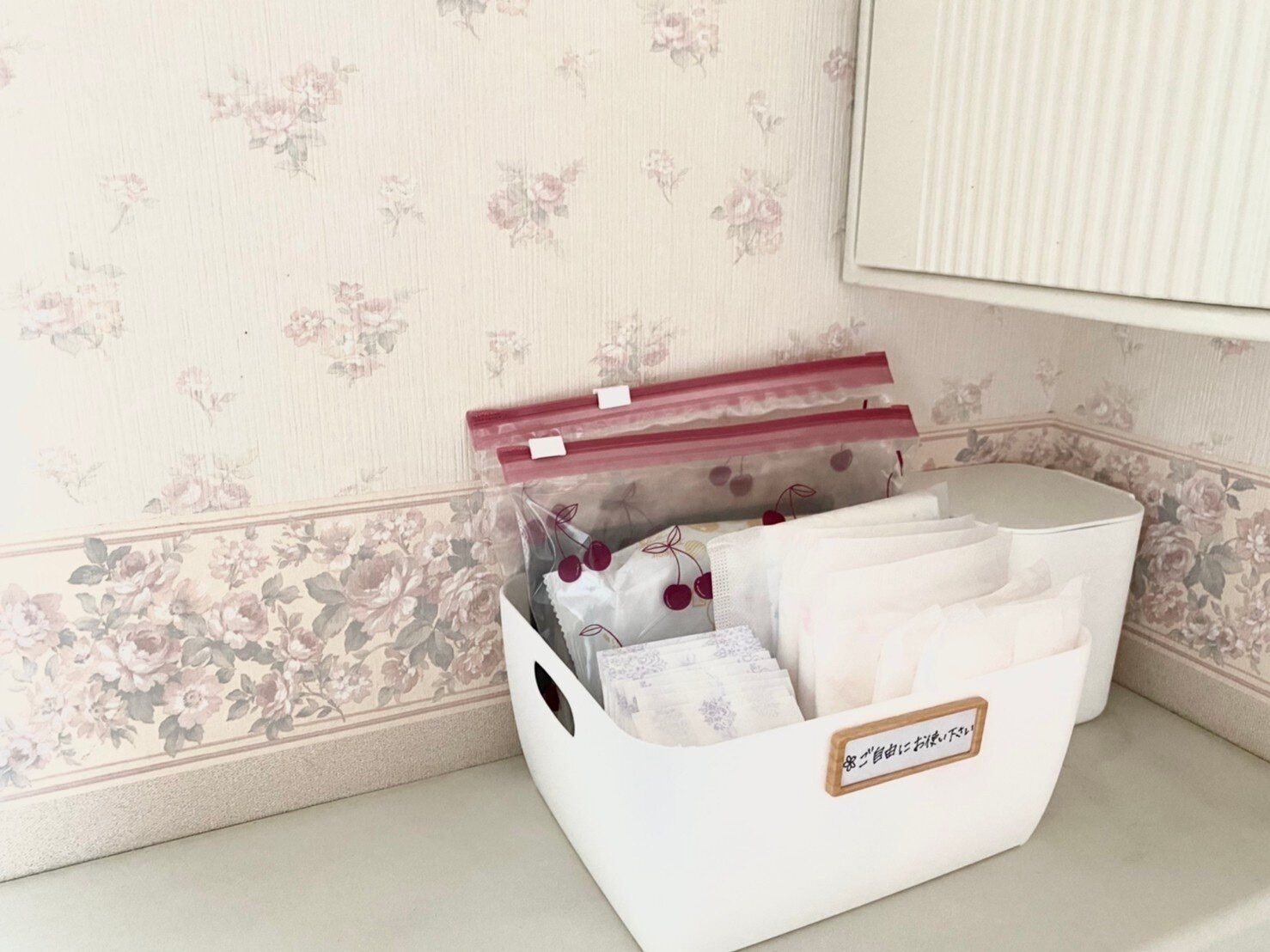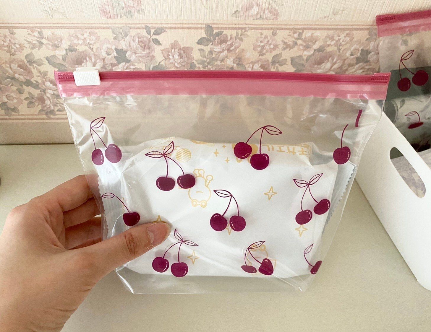 さらに、トイレでの使用例を。使い捨てのお掃除シート、詰め替え用をケースではなくこのジッパーバッグに入れるとぴったり!乾燥も防げるのとスライドジッパーで開け閉めしやすくなっていてしかも見た目も可愛い。