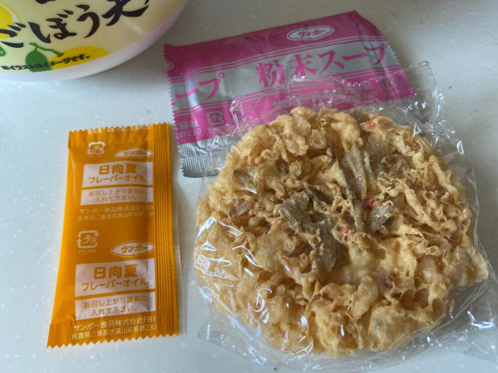 麺の上にごぼう天、粉末スープをかけて熱湯を注ぎ約5分。仕上げ日向夏フレーバーオイルをくわえて良く混ぜたら完成です。
