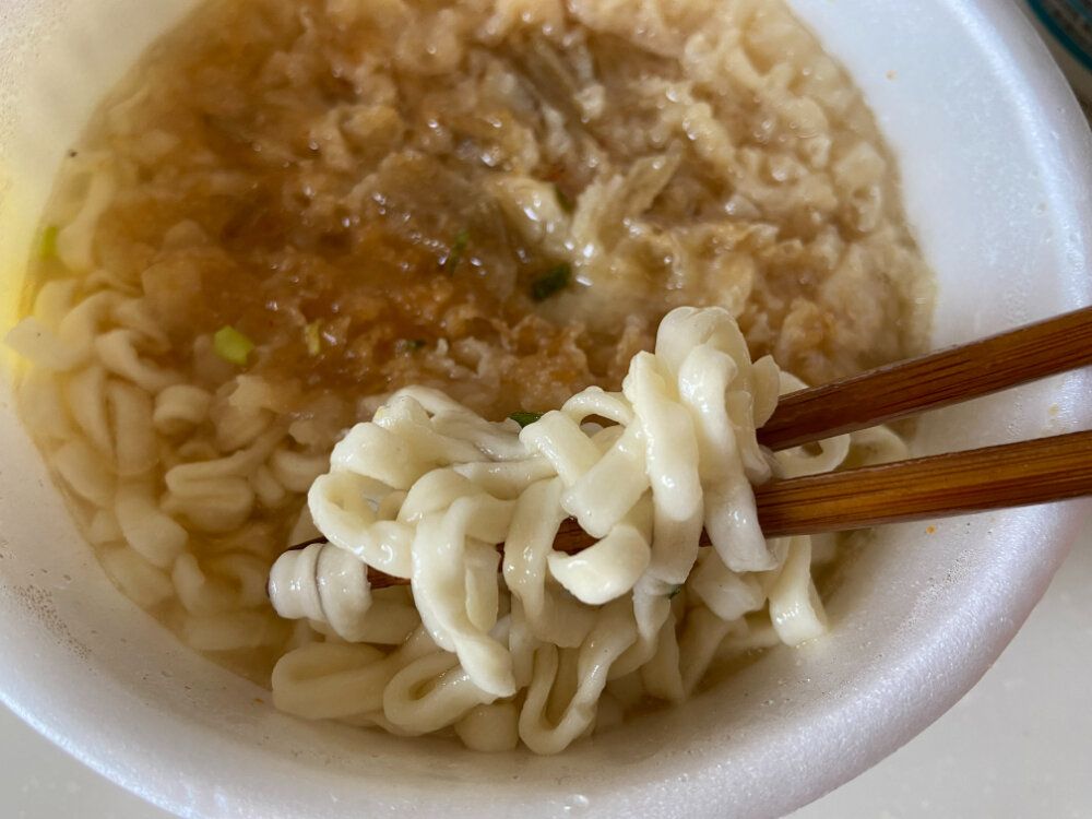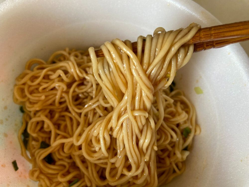 カップの中には小袋が2つ。麺の上にかやくを入れてからお湯を注ぎ、約2分。細麺なのであっという間にできあがりますね。