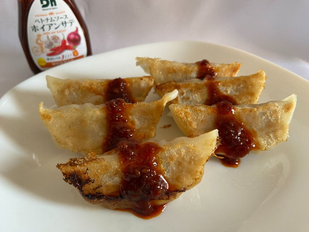 カリッと焼いた餃子にホイアンサテをかけて食べてみると、新感覚のおいしさ!予想以上に唐辛子の辛さがしっかりあって辛いのですが、口に広がる香りや旨みであとをひくおいしさ!餃子に相性抜群です。