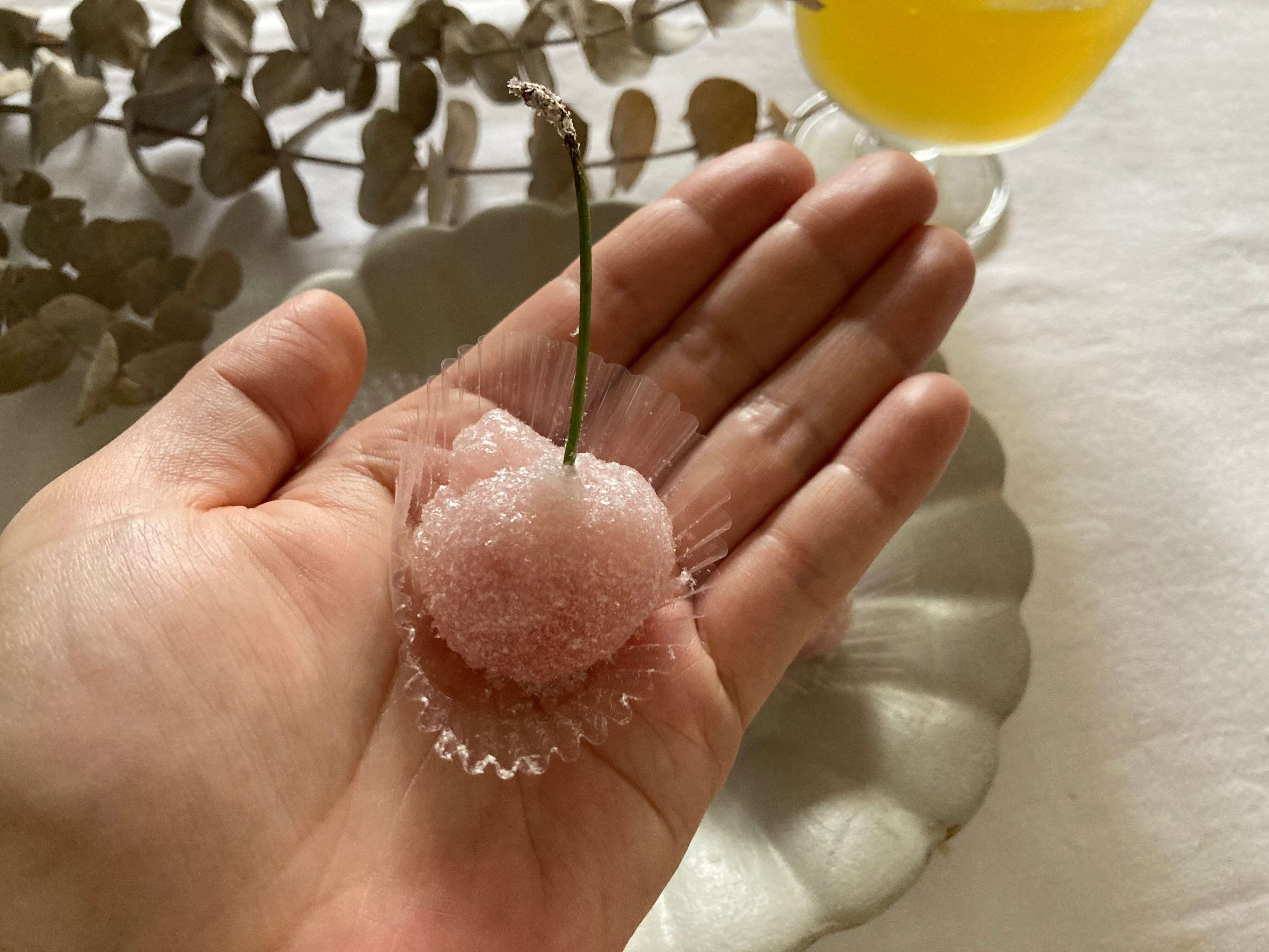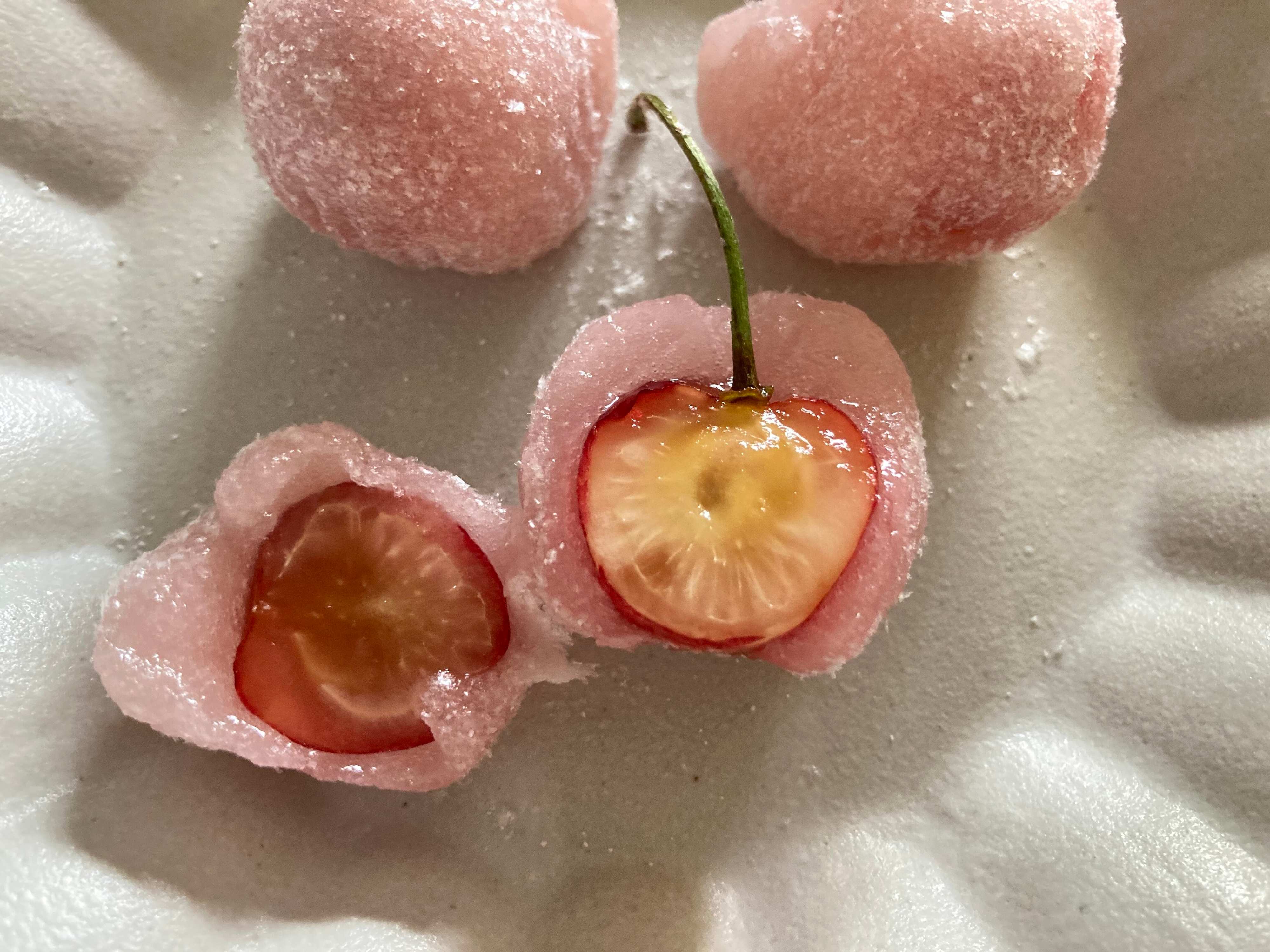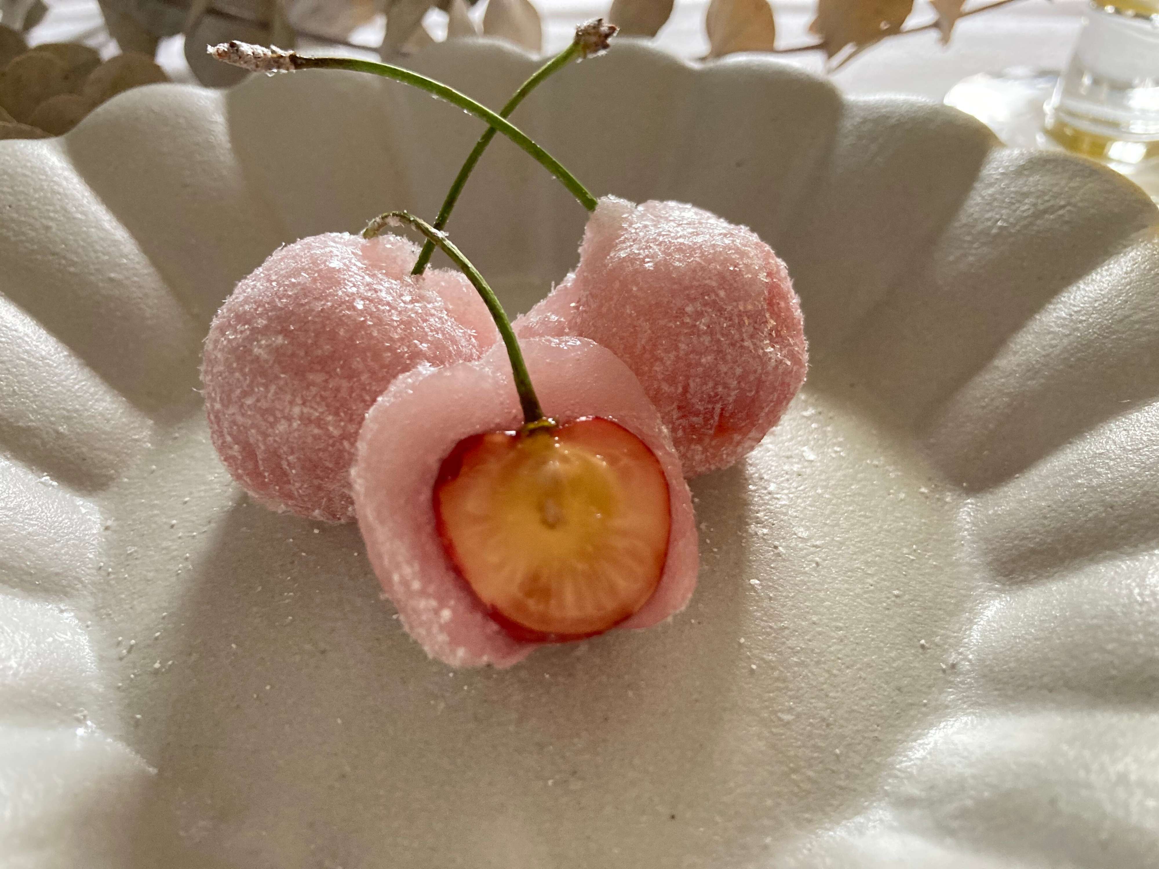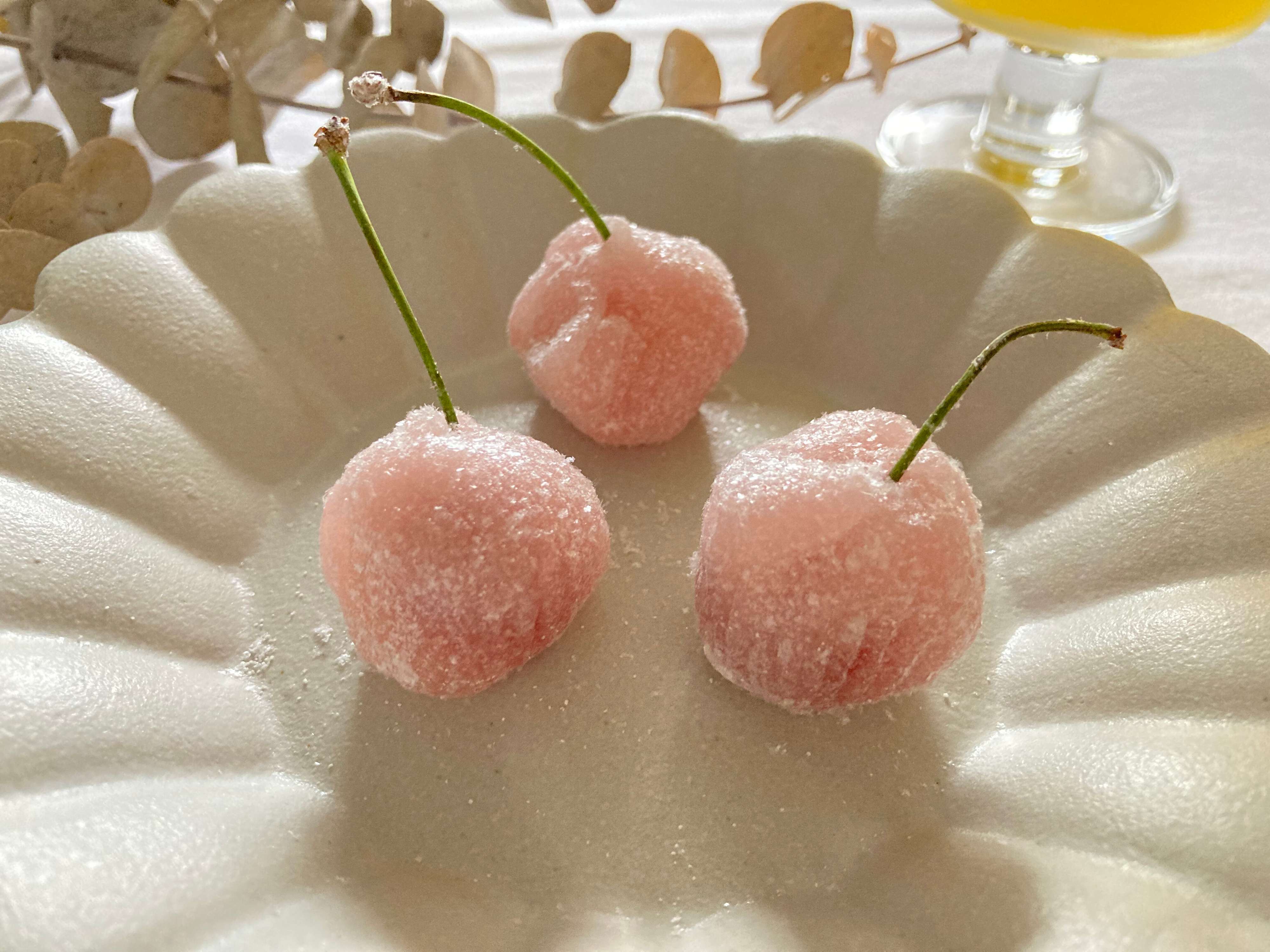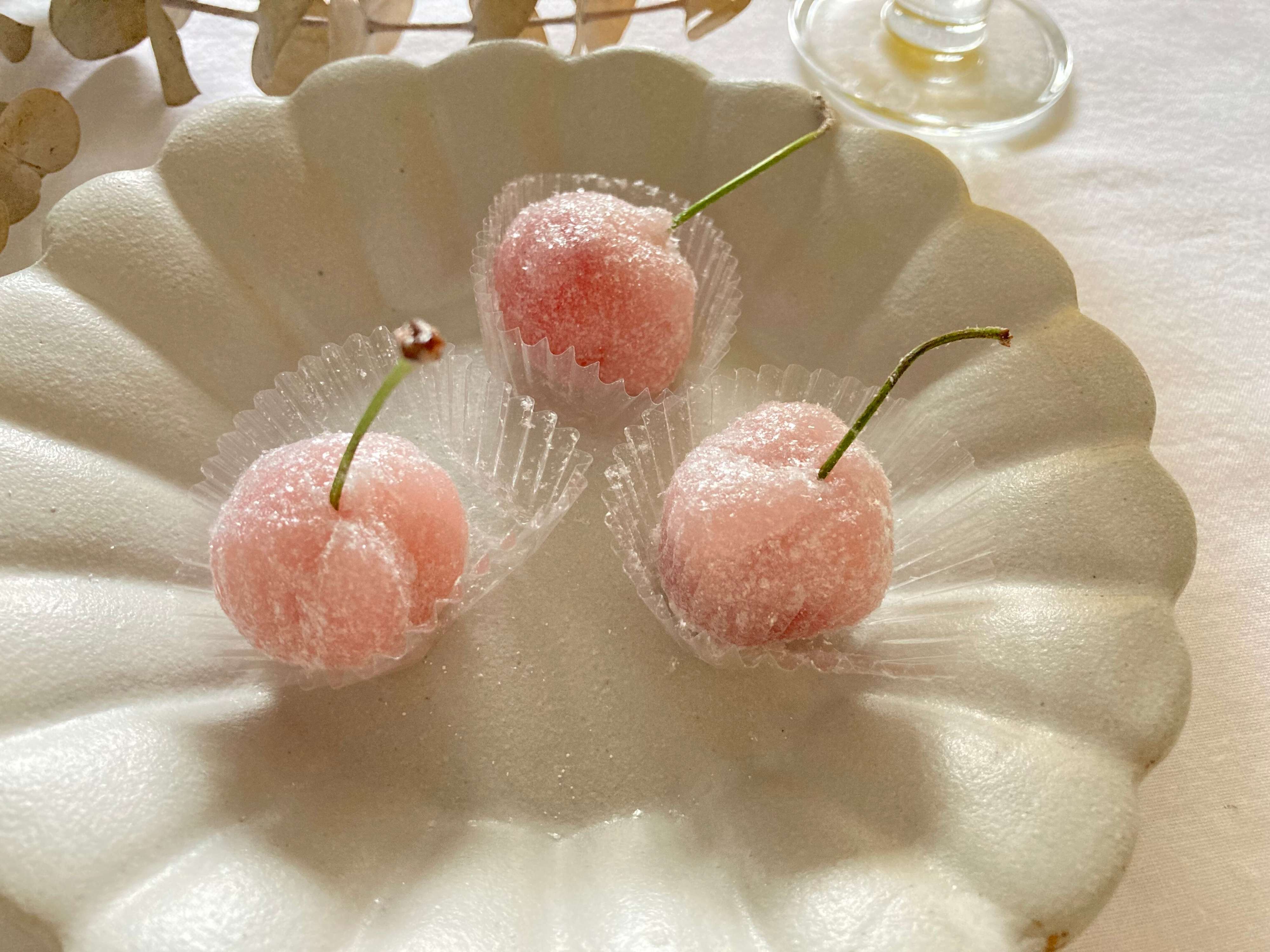 「さくらんぼ餅」は、ピンク色に色付けした求肥でフレッシュなさくらんぼを包み、表面に粉末オブラートと砂糖がまぶされています。