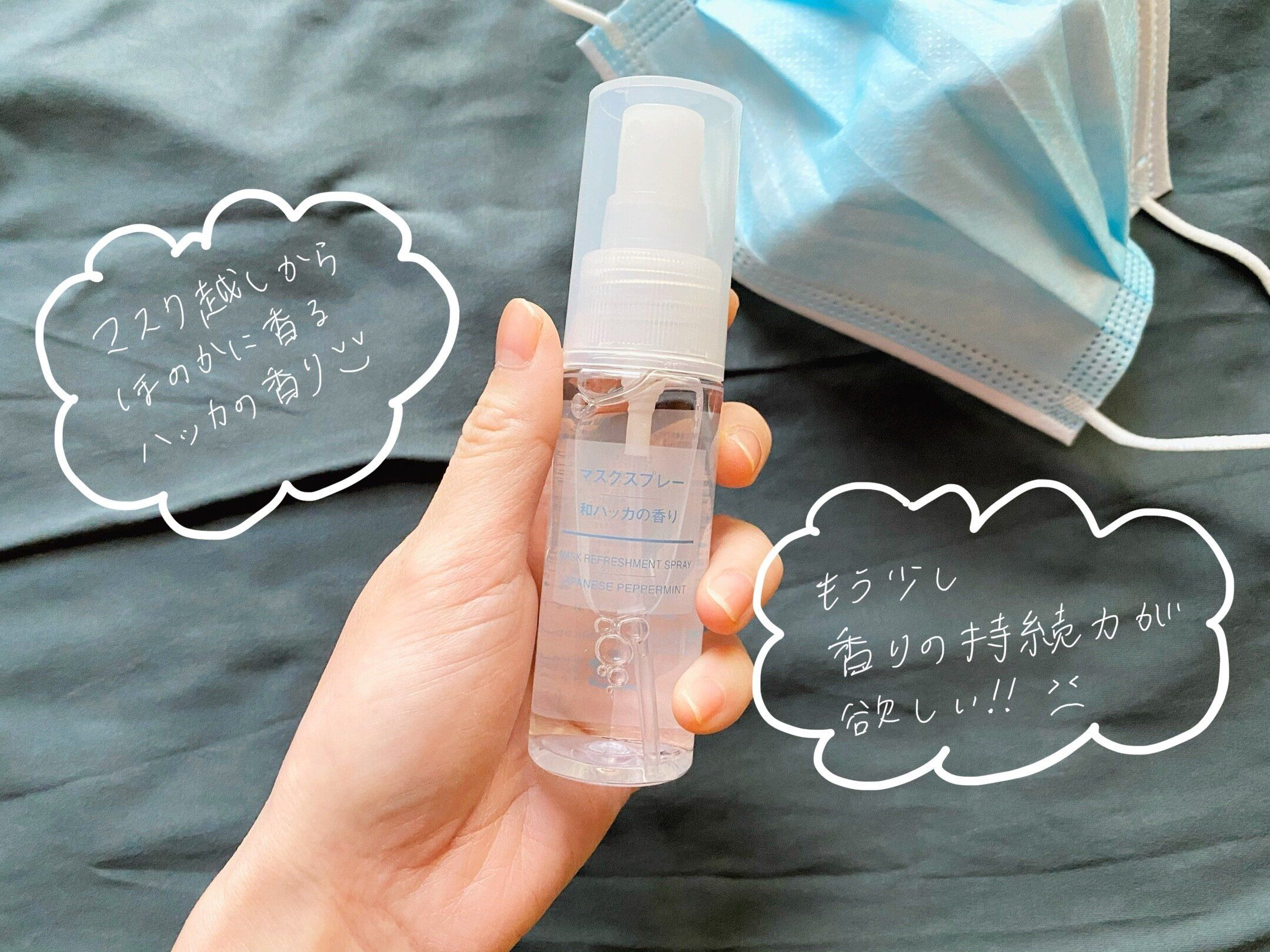 マスクの外側へのスプレーで本当に香るの?と疑問でしたが、装着したらマスク越しにハッカの爽やか〜な香りが。加えて鼻がスーッとする感じもあり、心地良い気分になりました!ハッカの香りは思ったよりもキツくなく、ほのかに香ってくれるのでリフレッシュにちょうど良いと思います。売り切れ続出なのも納得!