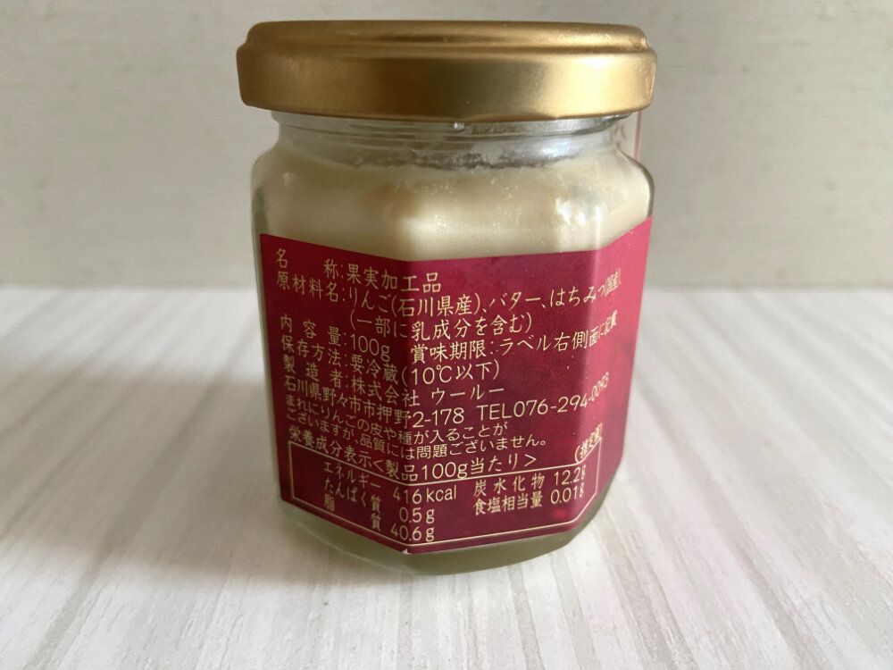 石川県の地元食材を使用したメニューが人気の「ビストロ ウールー」が製造しているこだわりの商品とのこと。原材料はりんご、バター、はちみつのみ!