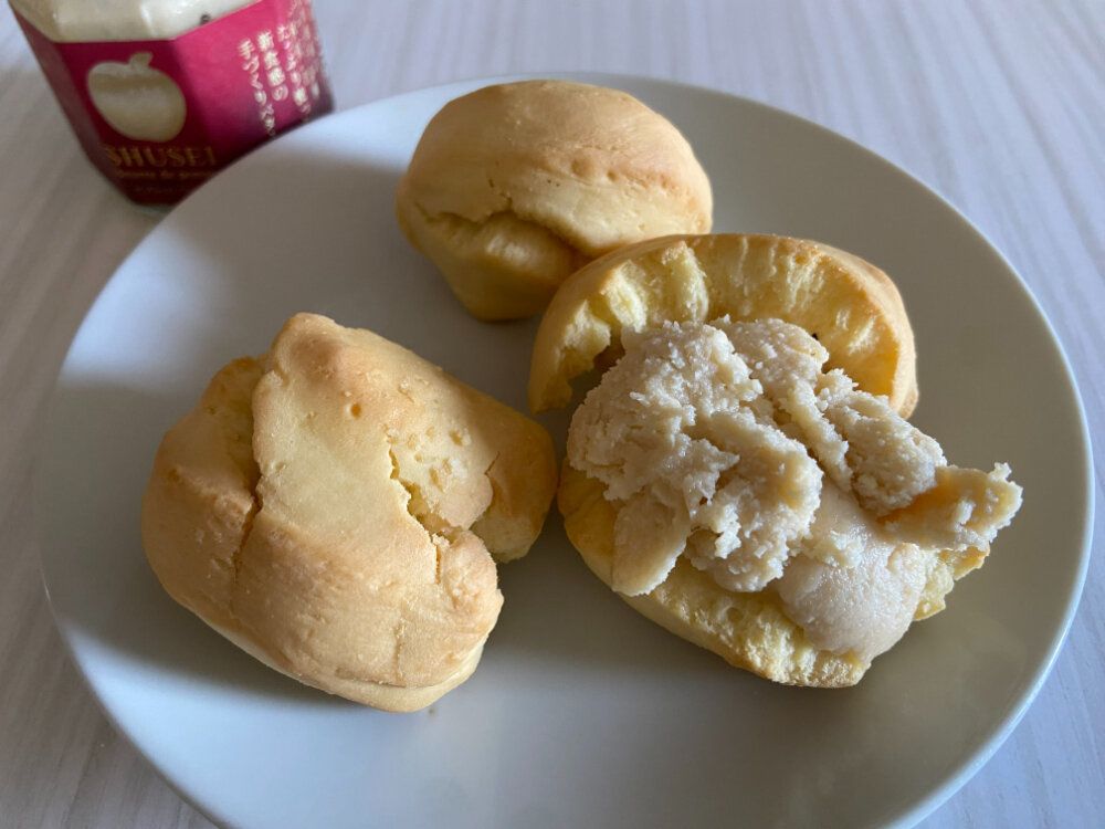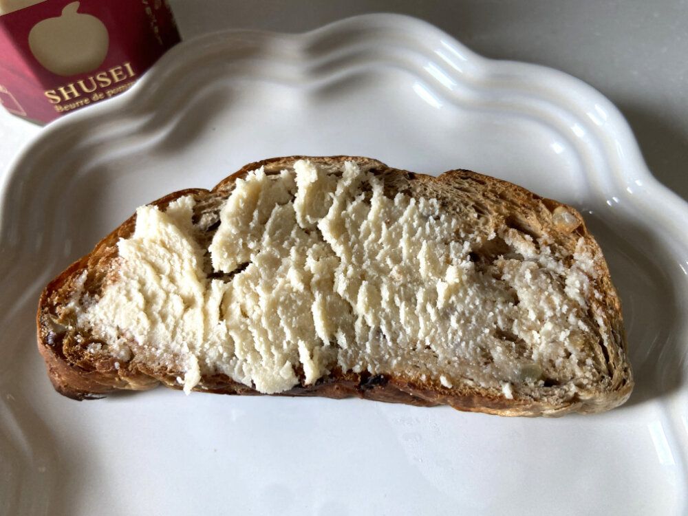 自然なりんごの風味や香りが広がって、意外とあっさりとした味わいの中にバターのコクがじわじわやってきてとってもおいしい!甘さも控えめなので、とってもやさしい味。りんごやバターの素材の味を感じつつ、パンのおいしさも引き立てる絶妙なバランスです。