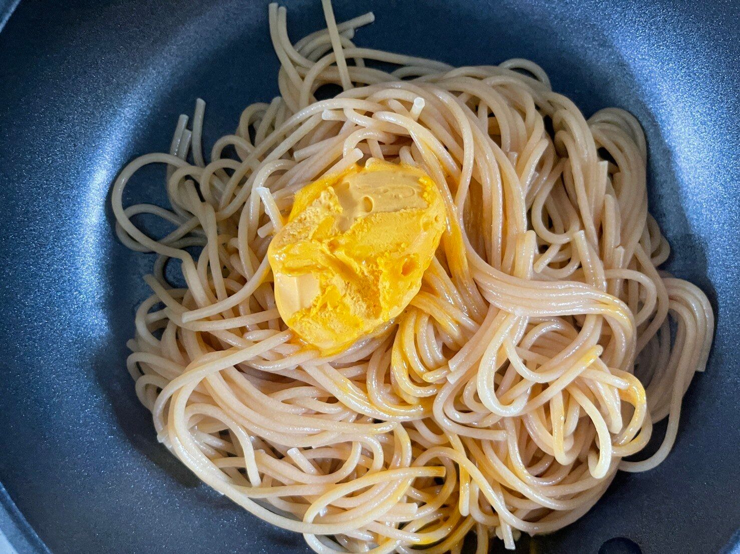 パスタと一緒に食べる際は茹でたパスタ1人分に大さじ1の「うにバター」を絡めるだけ!これだけで絶品!うにバターパスタが完成します。