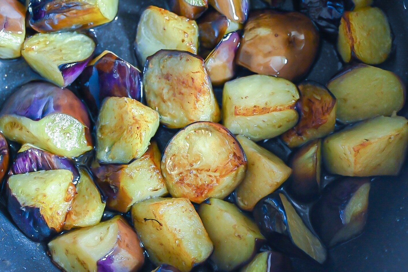 (1)なす、ピーマンを乱切りにし、しめじは子房に分ける。