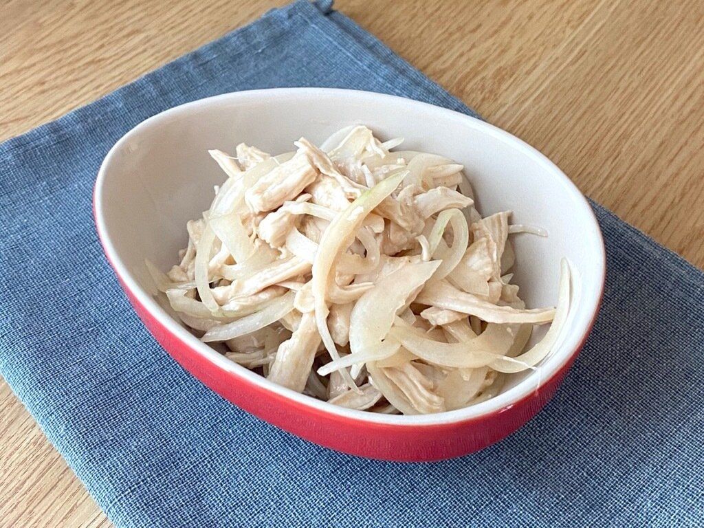 蒸し鶏とスライスした玉ねぎを「梅ごまだれ」で和えるだけで簡単におかず1品が完成します。たんぱくな鶏の味にももちろん合いますが、とくに玉ねぎとの相性が抜群。お酒のおつまみにすると箸もお酒もとまりません。