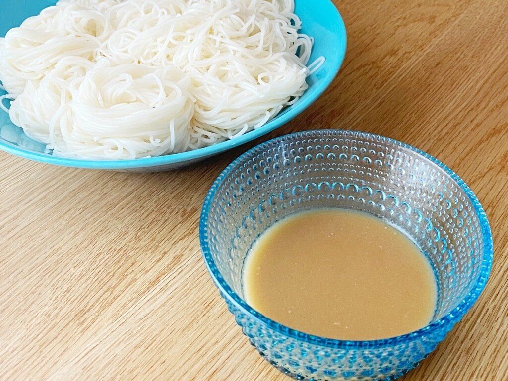 「梅ごまだれ」1に対し水1で希釈すると、素麺のつゆとしても使えます。すりごまが入っているので、素麺につゆがよくからみ、ごまの風味と梅の爽やかな味を楽しめます。少し酸味が強いと感じるかたは、市販の麺つゆにちょい足しするのもオススメ。いつもとは違う味わいの素麺を楽しめますよ。