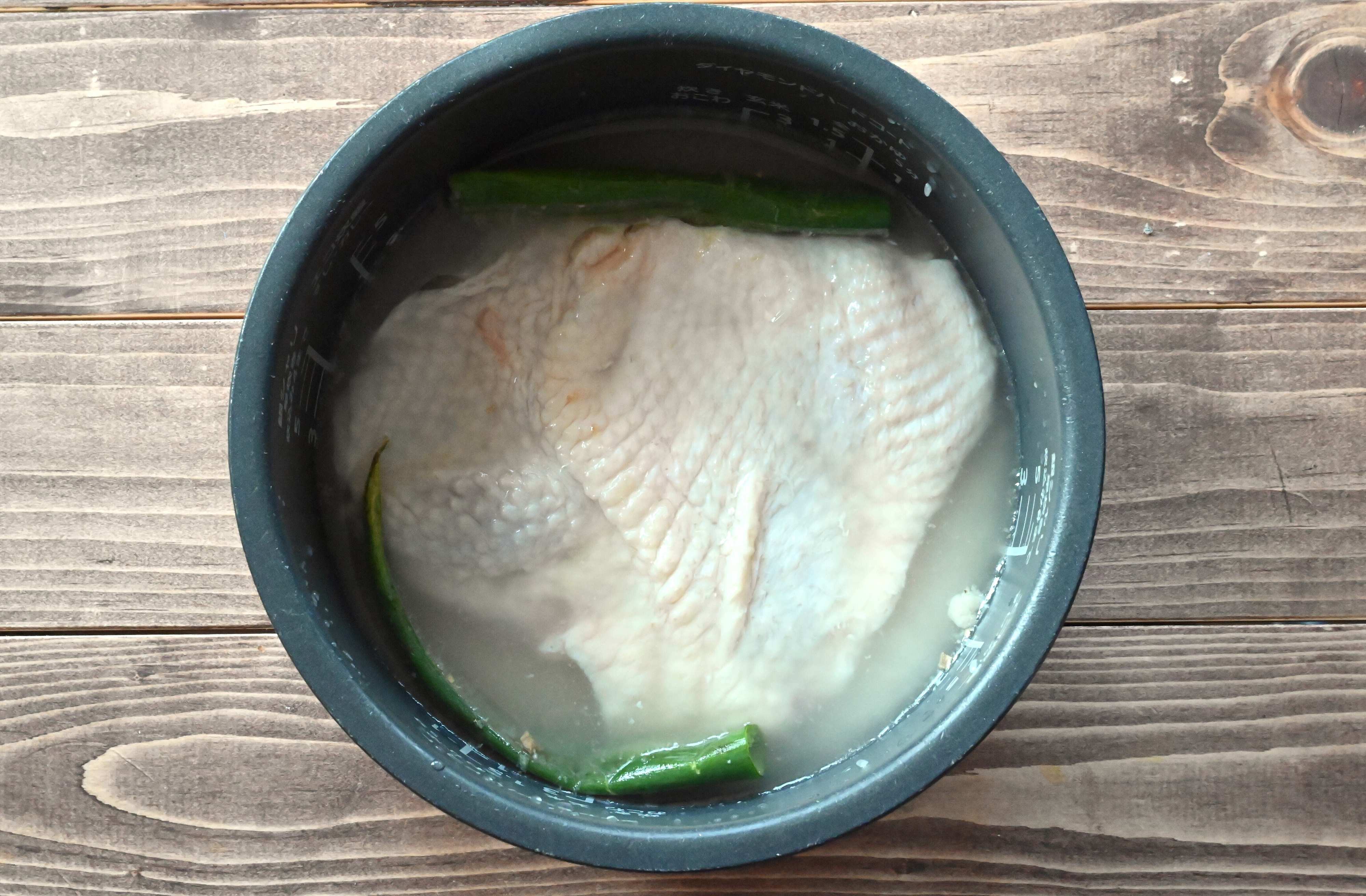 (5)炊き上がったら長ねぎは取り除き、鶏もも肉は取り出し、食べやすい大きさに切る。