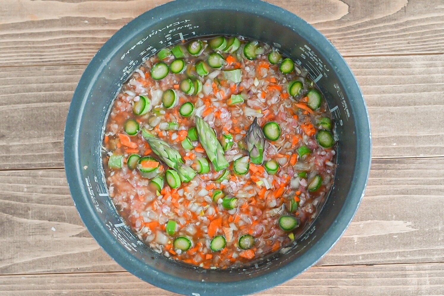 (3)豚ひき肉、にんじん、玉ねぎ、アスパラガスの茎を加えて混ぜ、
