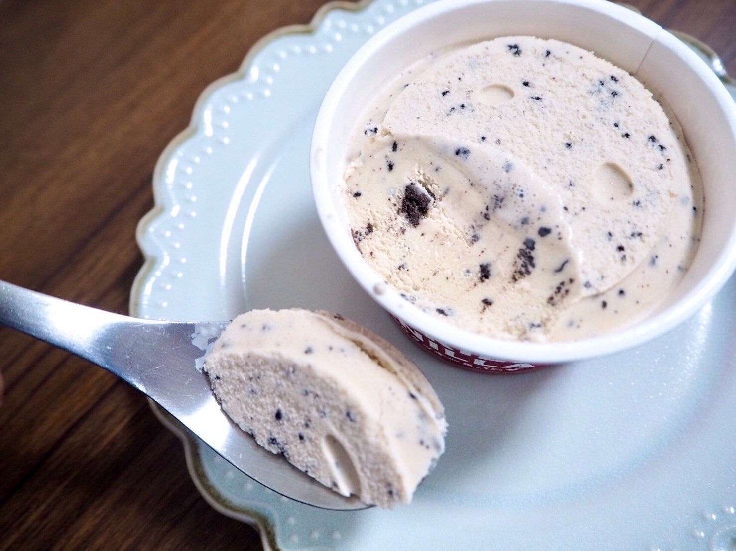 クッキー&バニラは、蓋を開けると、バニラアイスの中に砕かれたクッキーがお目見え。