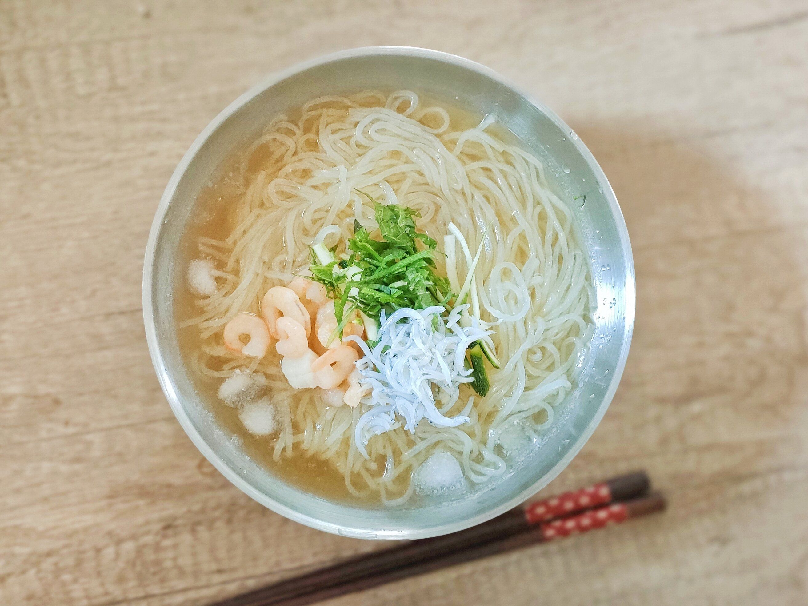お好みで卵やきゅうり、キムチをのせてとパッケージにありましたが、今回は大葉と海老とシラスをのせてみました。海老との相性を考えるとトマトも合いそうです。