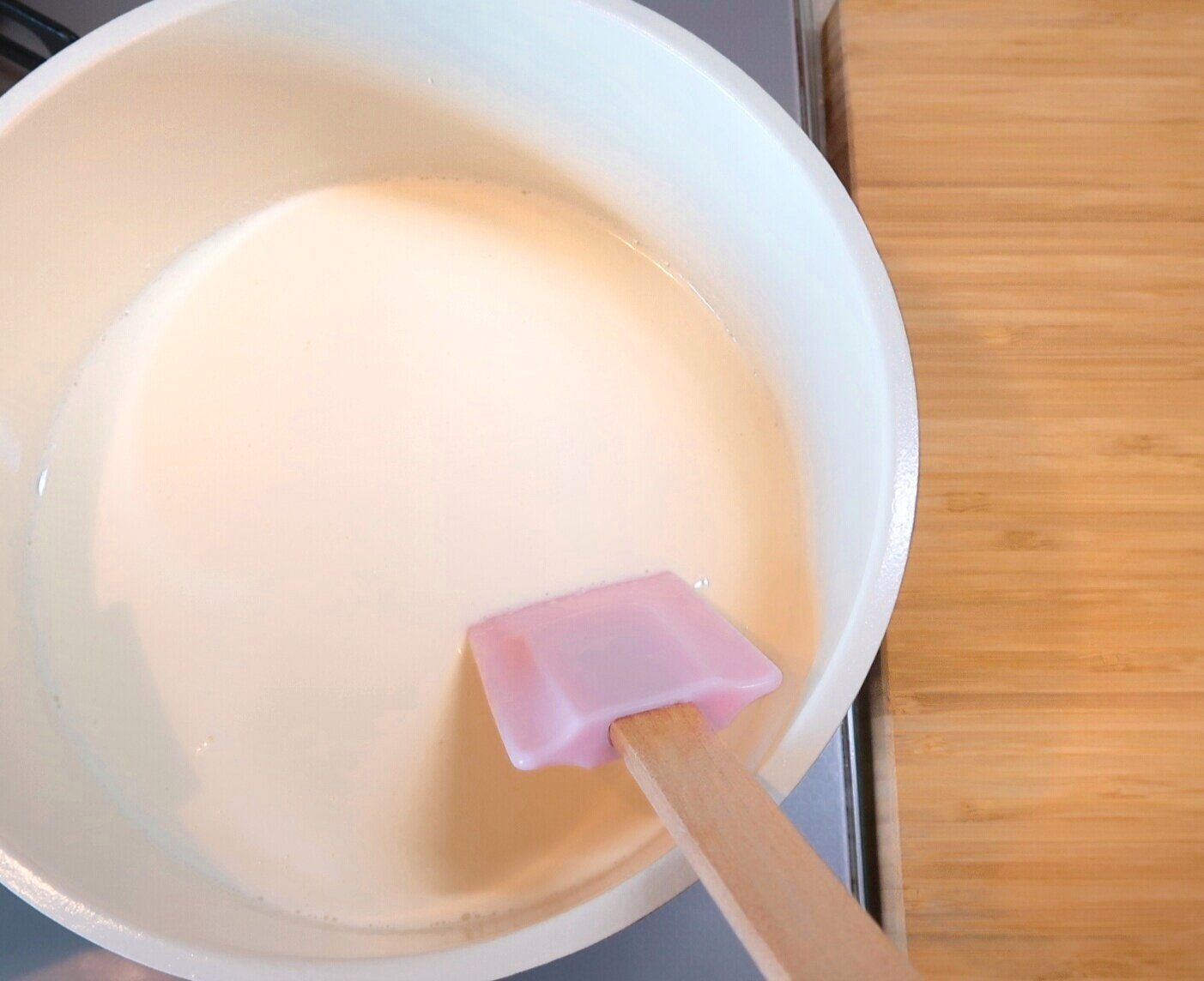 表面がフツフツとしてきたら火を止め、(1)の溶かしたゼラチンを加えよく混ぜ合わせます。