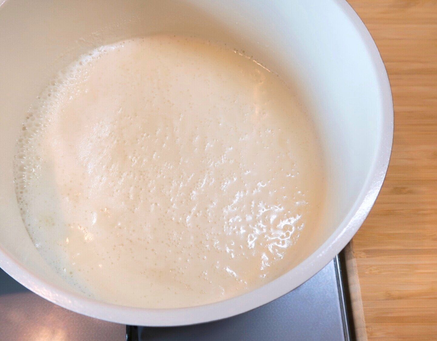 なべに牛乳、生クリーム、砂糖を入れ弱火にかけ、ときどき混ぜながら加熱します。