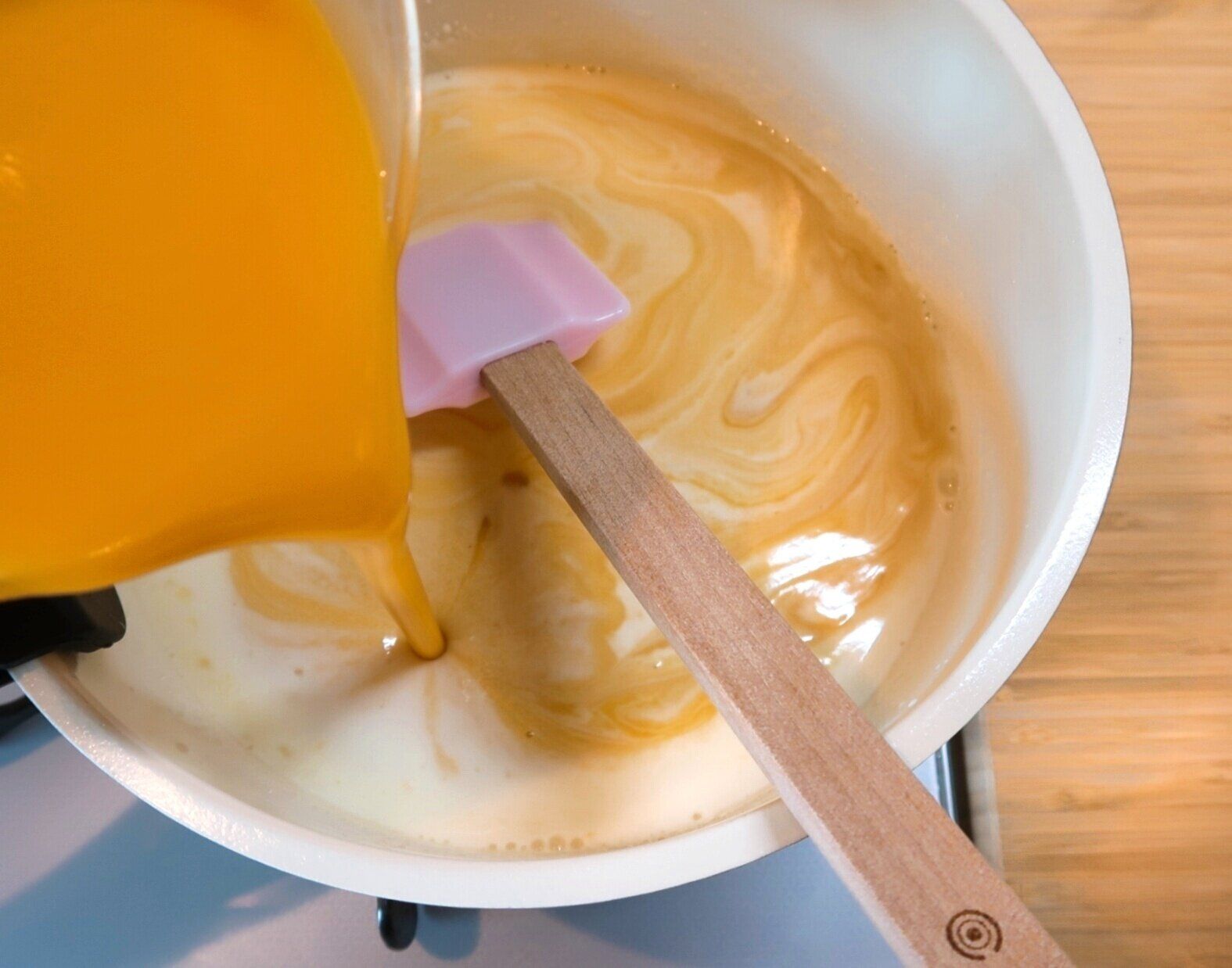 つづいてマンゴーピューレを少しずつ加え、その都度よく混ぜ合わせます。