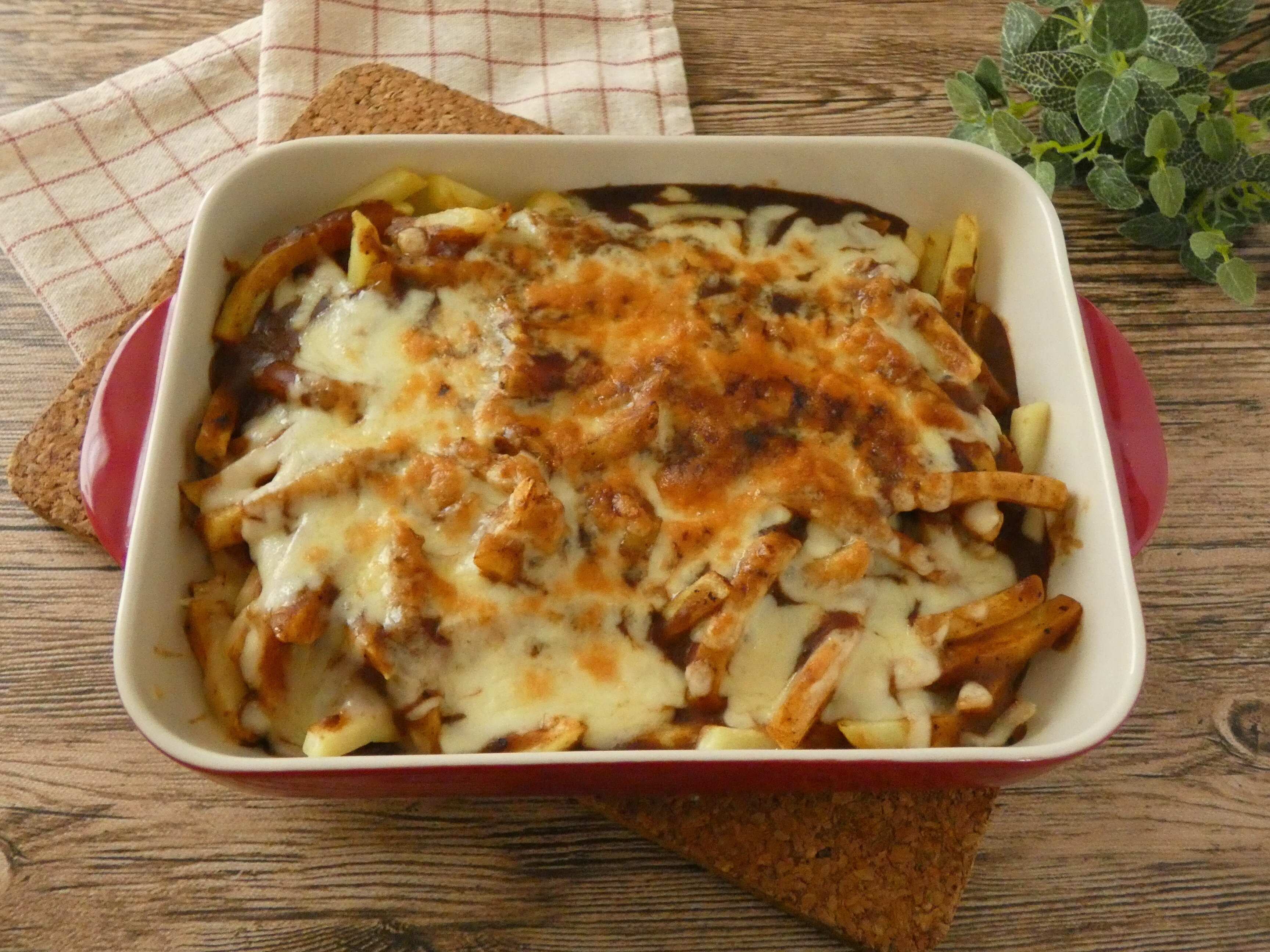 フライドポテトを電子レンジで加熱し、レトルトのミートソースやホワイトソース、カレーなどをかけてピザ用チーズを乗せて焼くだけ!!ボリュームたっぷりなポテトグラタンになります。