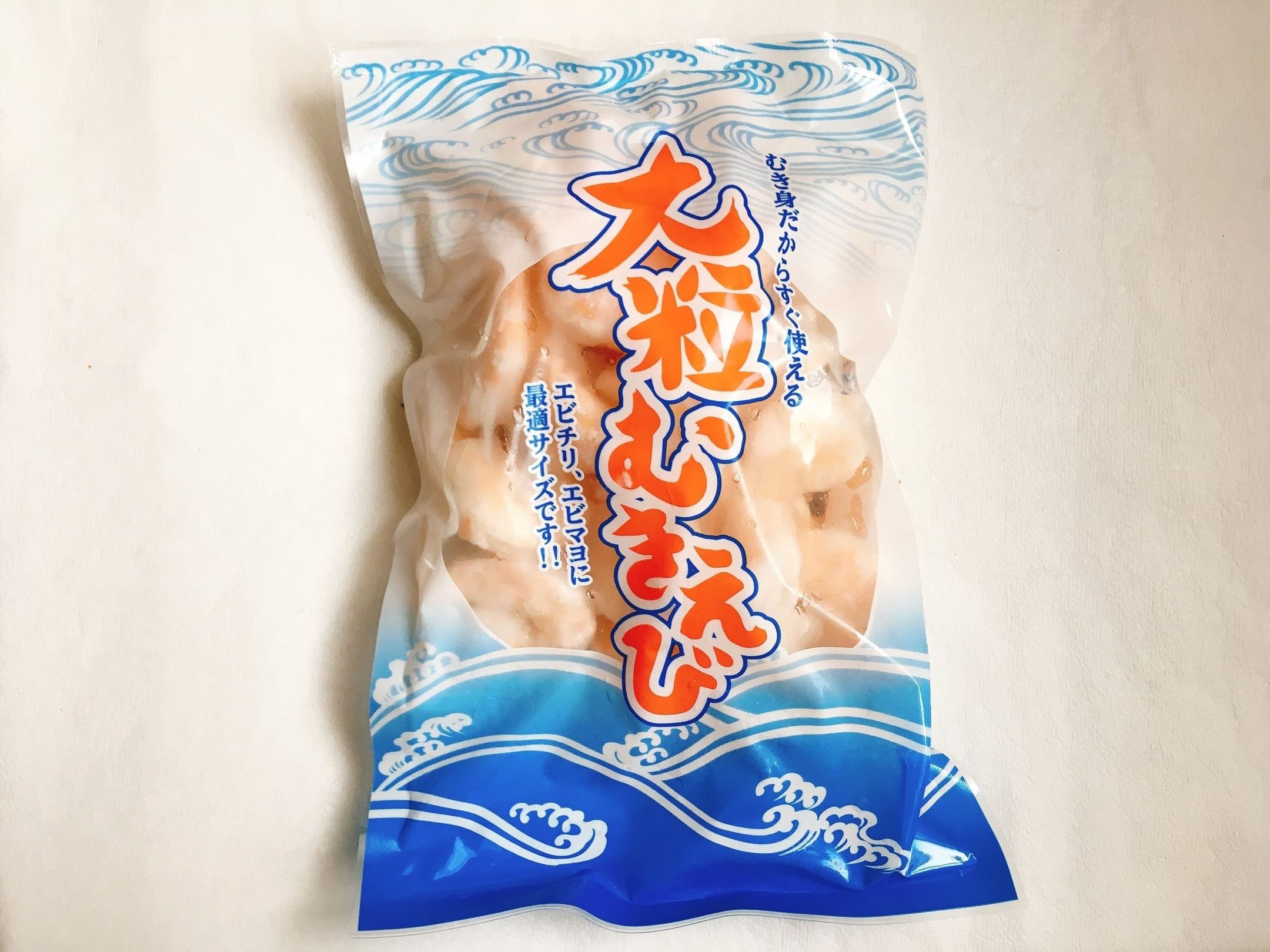 大粒むきえびは、300g・644円。大粒のエビが下処理された状態で冷凍されています。解凍後、片栗粉をつけて焼き、ケチャップや豆板醤で味つけすれば簡単エビチリの完成!