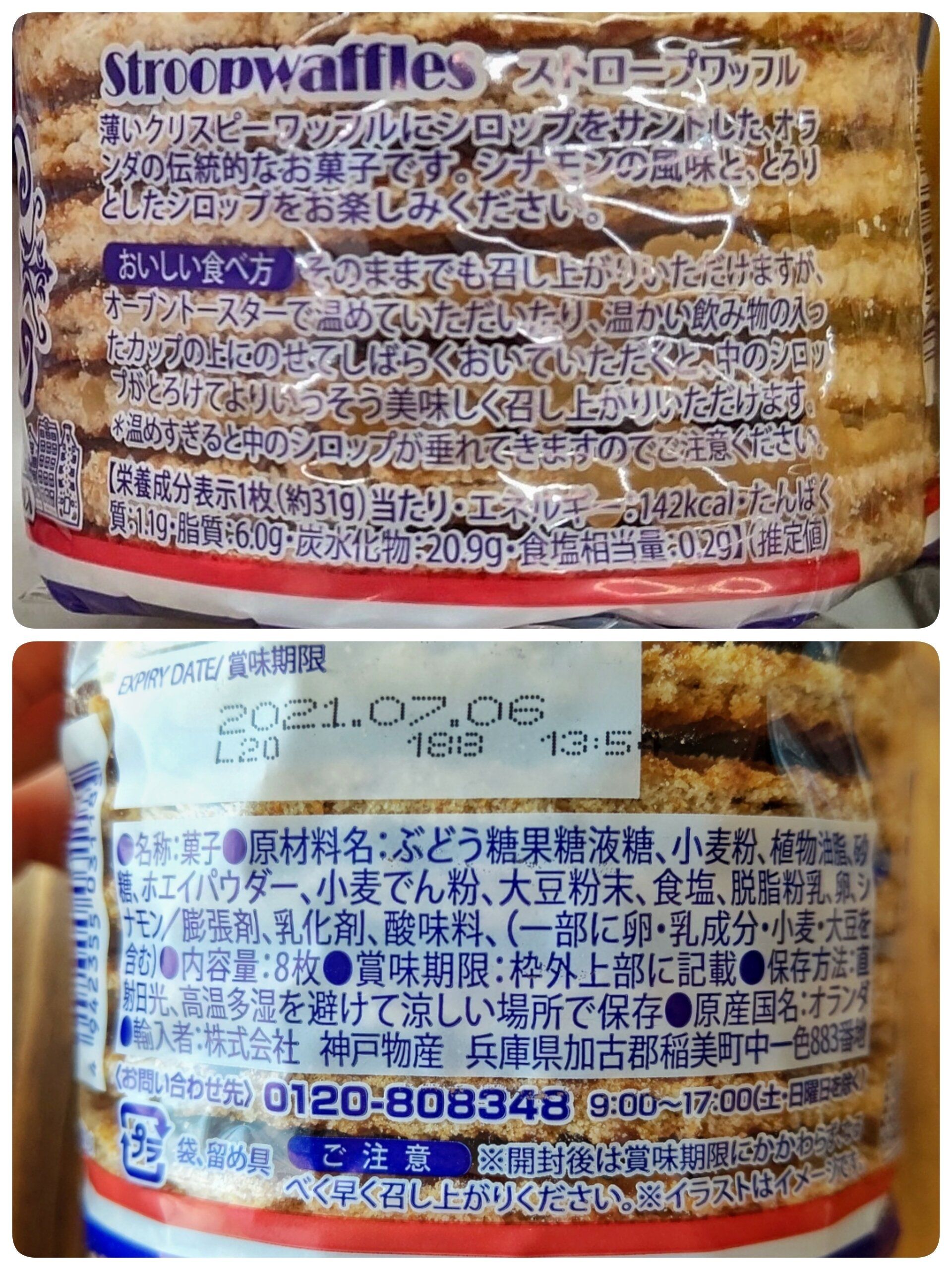 側面には、ストロープワッフルの原材料と説明、おいしい食べ方などが書かれています。