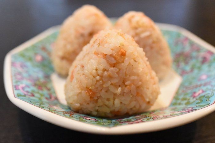 おにぎりの真ん中に「鮭フレーク」を入れると、食べながらぽろぽろこぼれやすいので、「鮭フレーク」をご飯に混ぜてからおにぎりにしましょう。