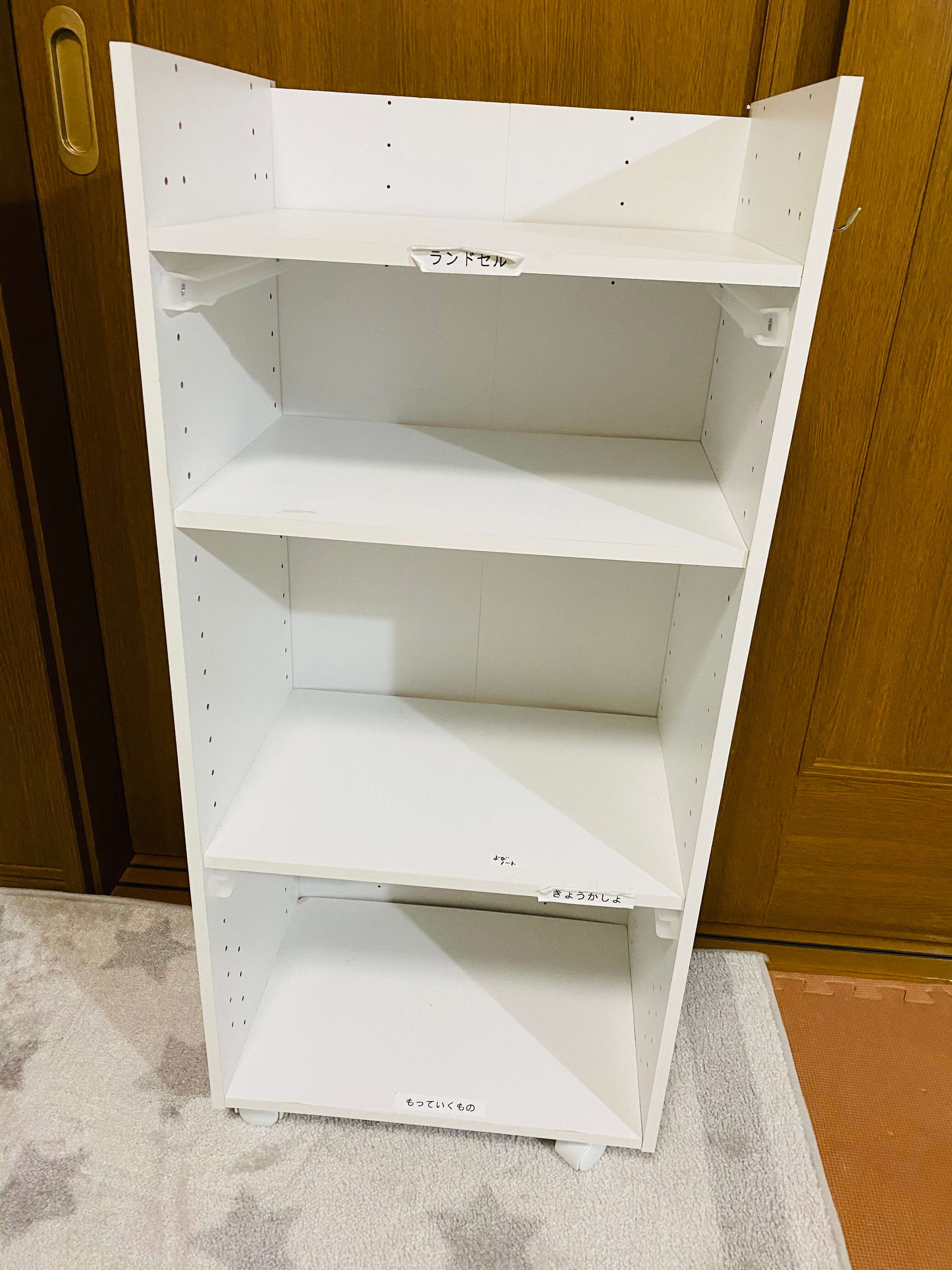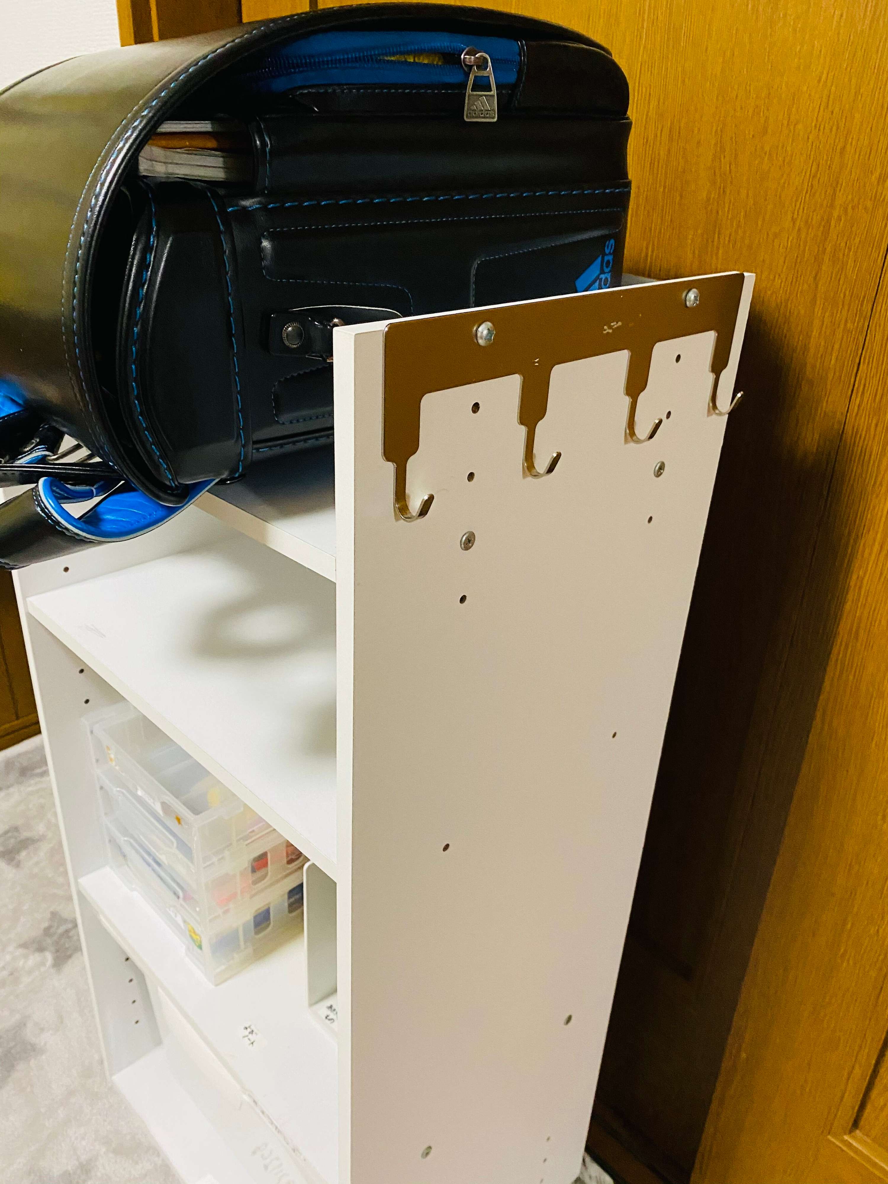 我が家は画像のように上の棚板を少し下げてランドセルを置けるようにしています。
