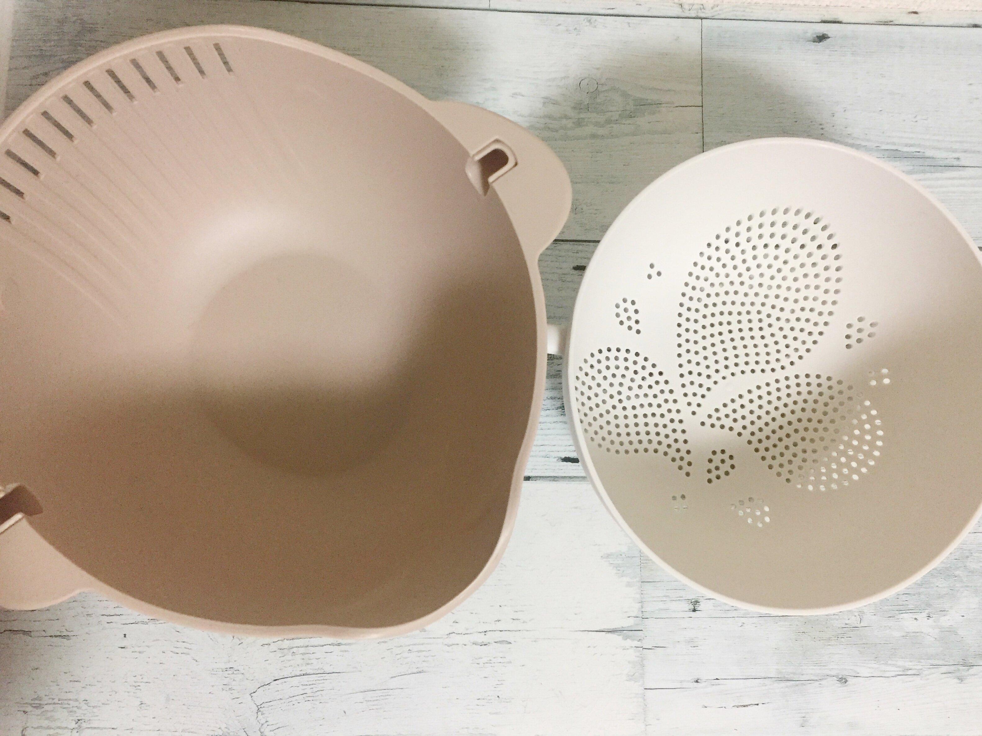 カラーもかわいい機能性抜群のキッチンアイテム「KITINTO ザル&ボウルセット」(330円)。