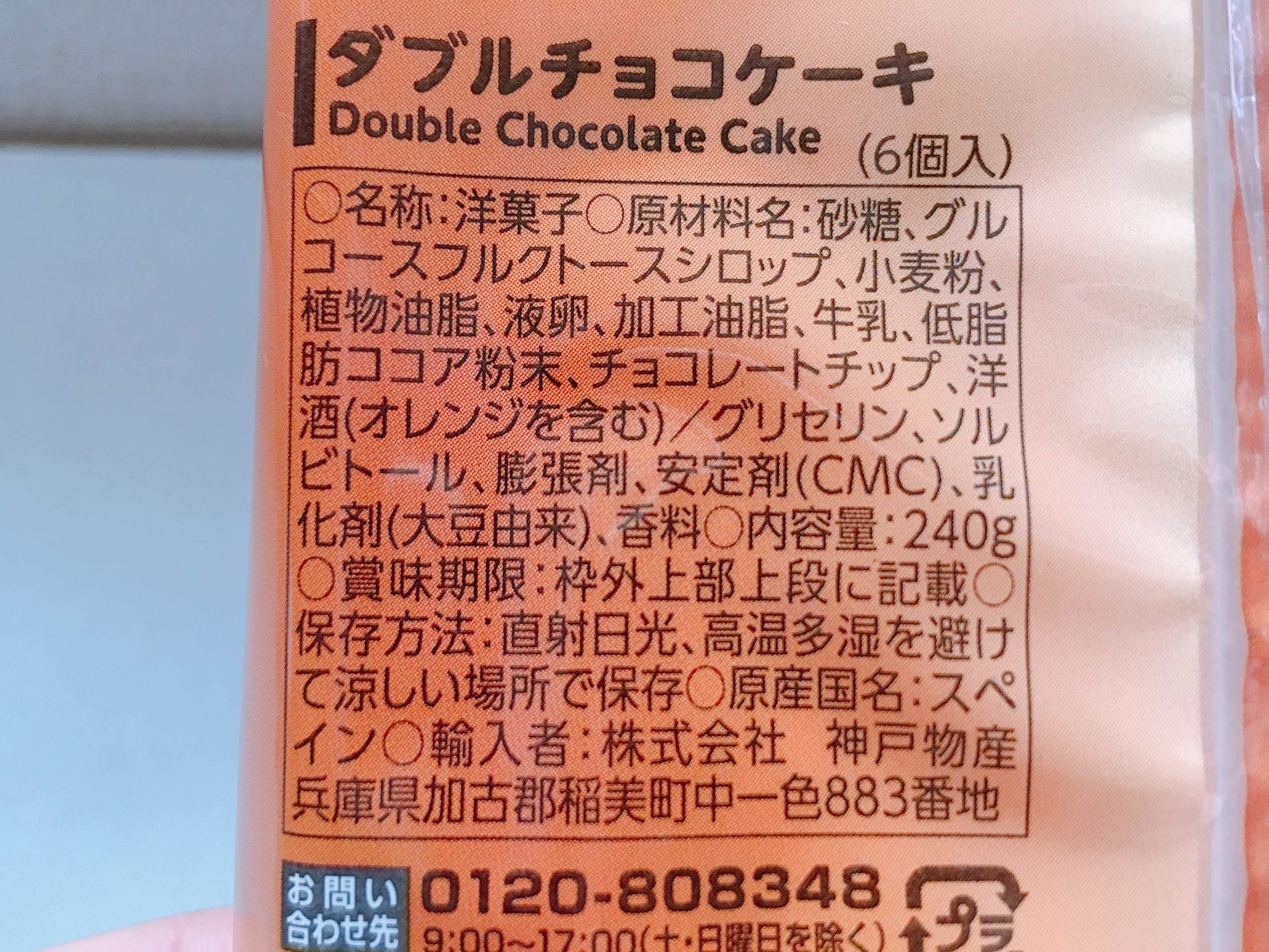 ダブルチョコケーキの原材料を見ると、オレンジ系の洋酒が入っています。小さいお子さんやお酒が苦手なかたのおやつには不向きですが、大人のスイーツとしては優秀!洋酒入りのお菓子が大好きな私としては、期待が高まります。