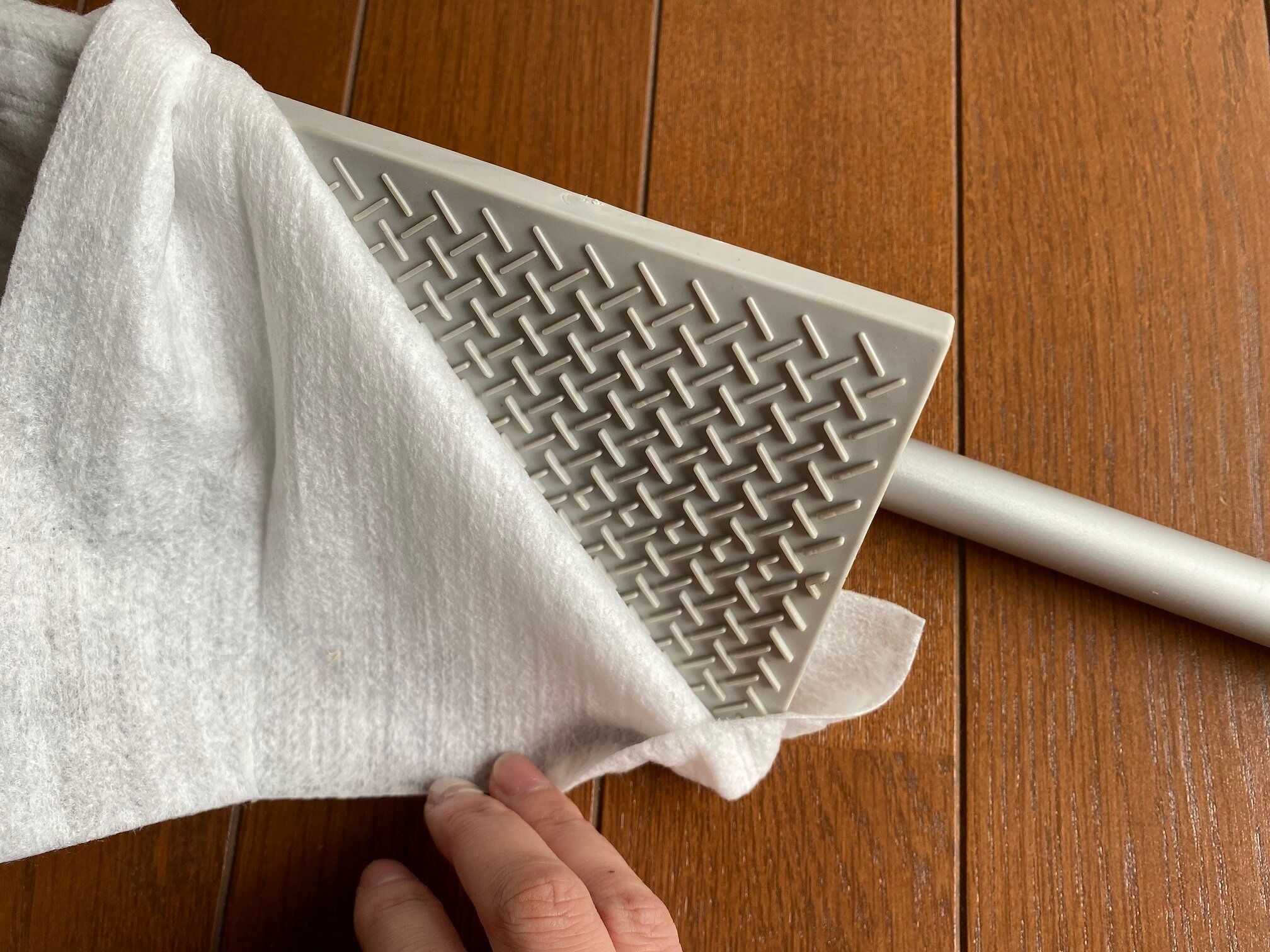 見た目はふつうフローリングワイパーのものとあまり変わりませんが、特徴は底面がギザギザになっているところ!合成ゴムの素材で、凹凸があるのでゴミをキャッチしやすいつくりになっているんです。