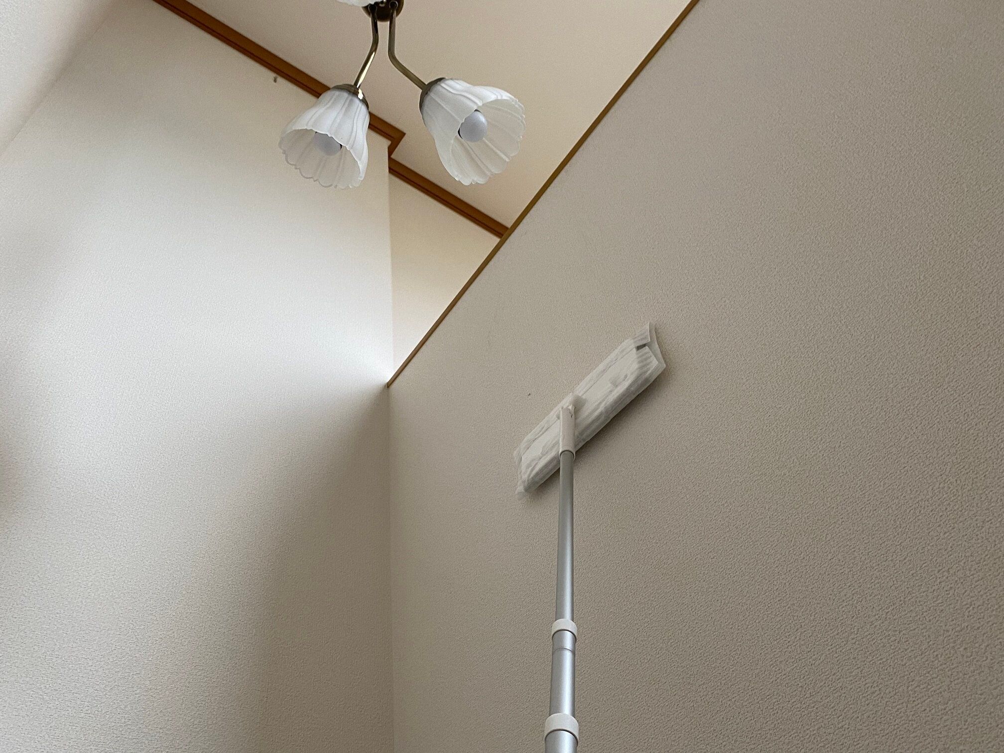 ドアの上、階段吹き抜けなど高いところも踏み台なしで届く!さきほど紹介したとおり、ゴム素材なので力を入れても壁を傷つけることなく汚れが拭き取れます。