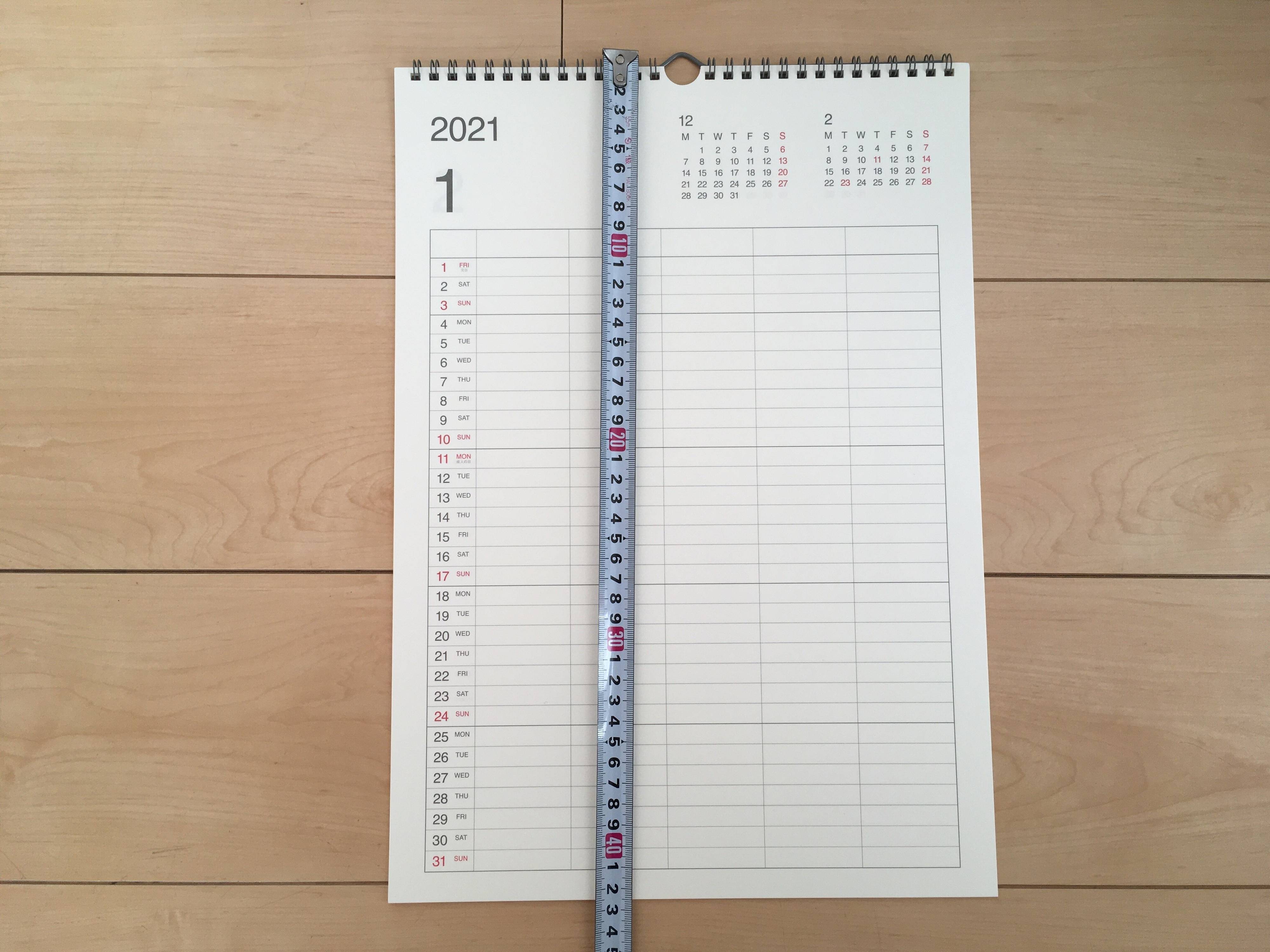 今回私が活用例を紹介するのは、無印良品の「ファミリーカレンダー」(税込990円)。縦の長さは約42cm。日付が縦に並んでいて、各日程のの横には5列分のマスがあります。このマスをどう使うかが、このカレンダーのポイント。