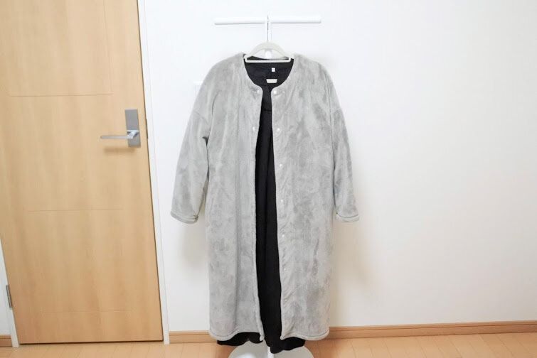 毛布に包まれているようなあたたかさです。フードもなくえりぐりがスッキリしていて、スナップボタンで前をとめることができるので、このまま布団に入ることもできて便利です。