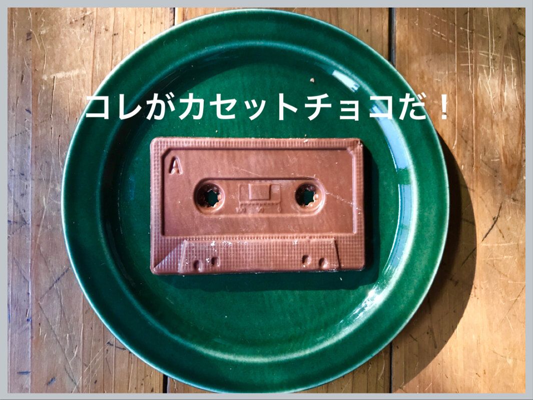 中にはクランチチョコが7個とチョコカセットテープが1個入ってました。あきまへんてー。かわいすぎますってー。アナログ派な私には何の違和感もありませんが、平成生まれのかたにはカセットテープとは何かわからないかもしれませんね。カセットチョコのパッケージの中には何とリアルカセットチョコが入ってました。価格は1,080円(税込)。