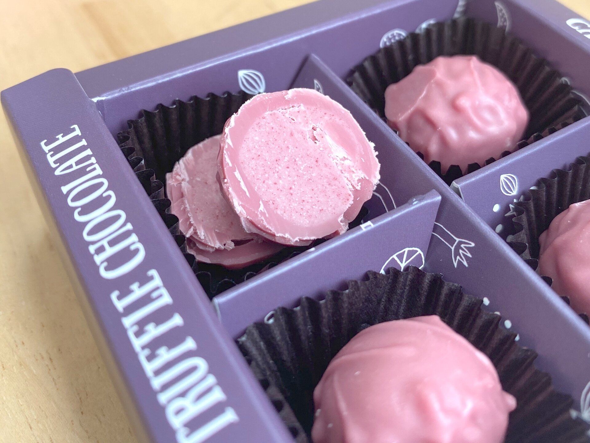 ラズベリーとシャンパンが香るガナッシュをルビーチョコレートで包んだトリュフチョコレート。価格は378円(税込)。