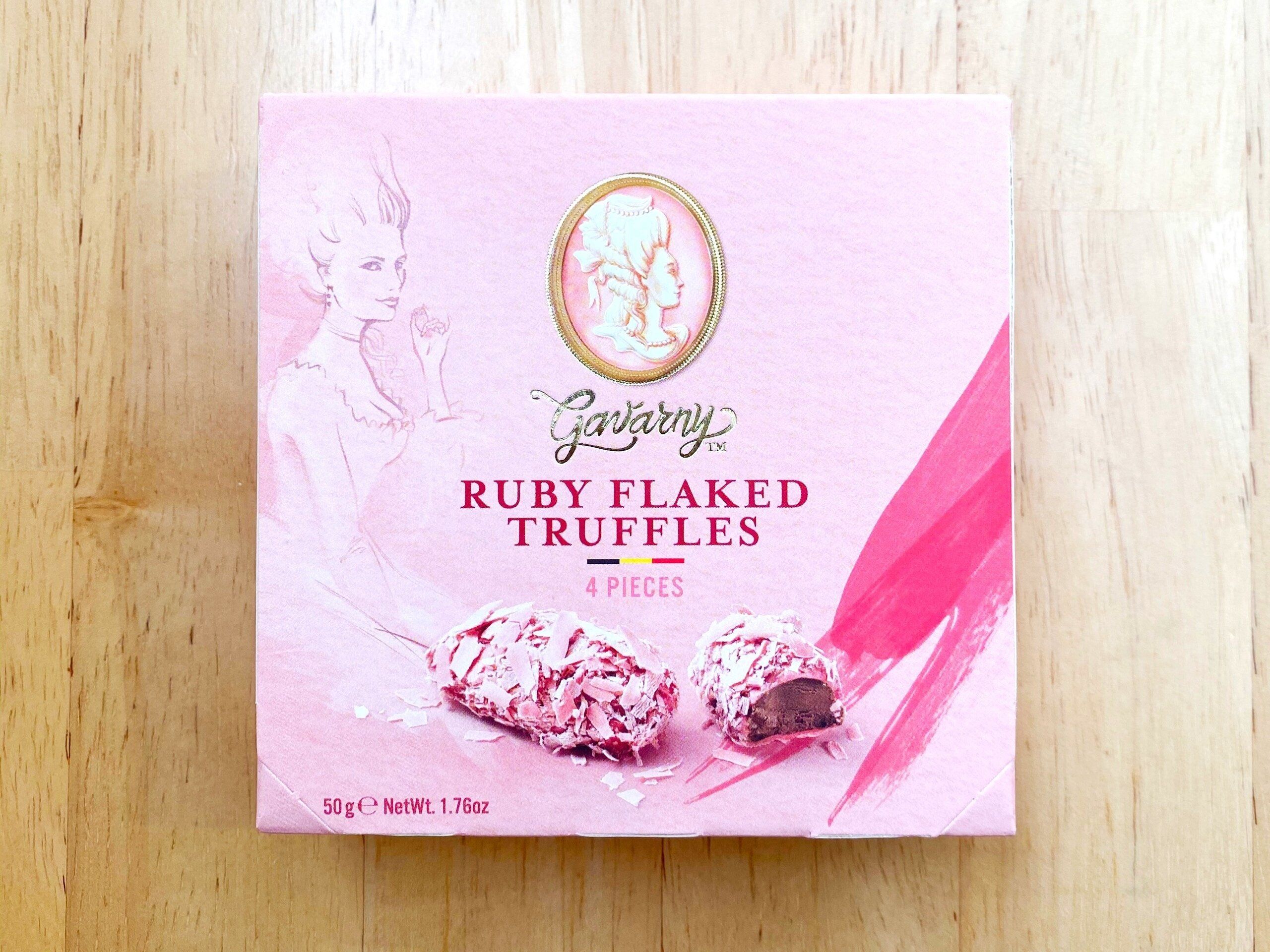 口溶けなめらかなガナッシュにルビーチョコレートをコーティングし、さらにフレーク状のルビーチョコレートがまぶされています。価格は378円(税込)。