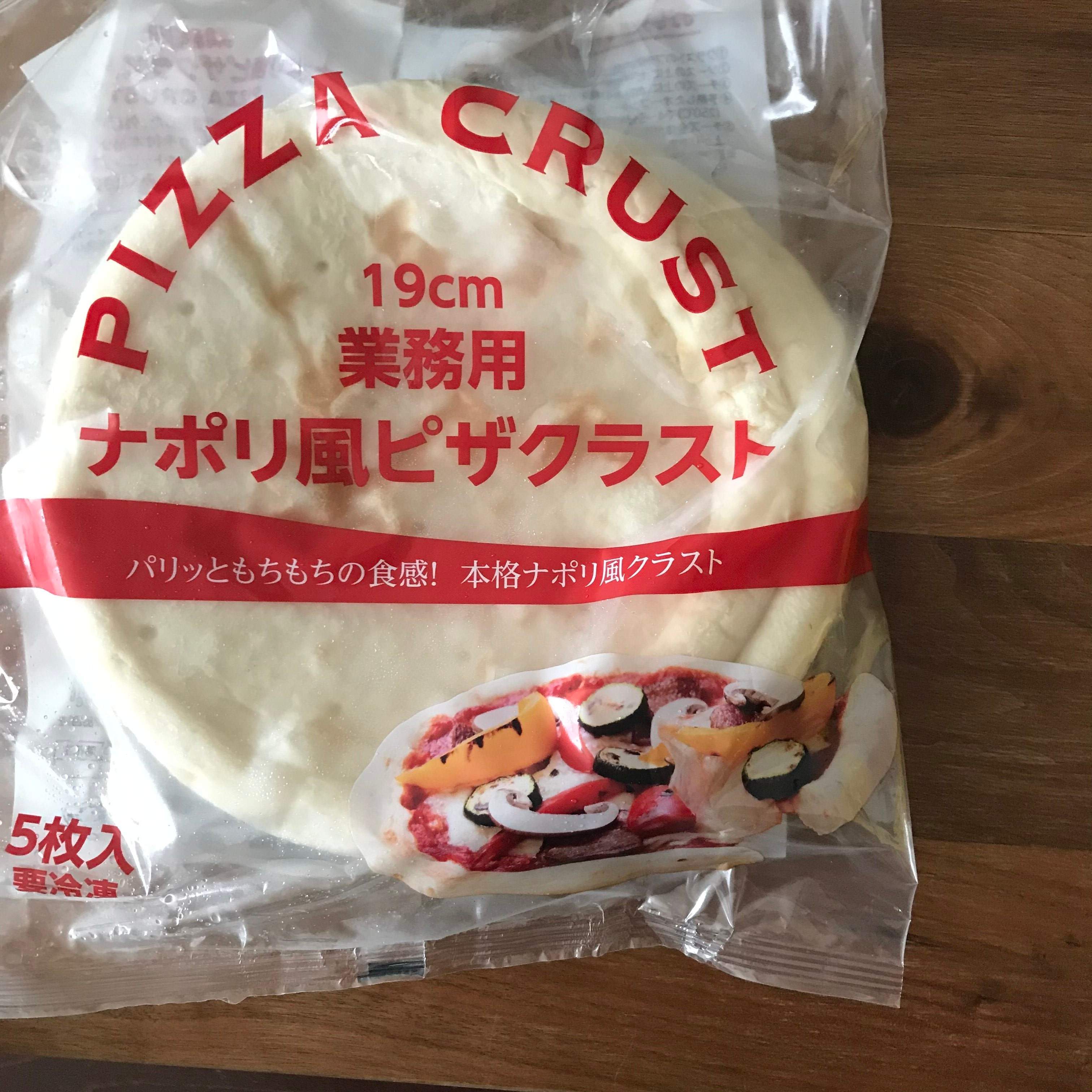 5枚入りなので1枚あたり70円きってます!サイズは19cm、スーパーの冷蔵コーナーで具が乗った状態で売られているピザよりやや小ぶり。でもね、それでもいろんな意味で満足感たっぷりのピザがつくれちゃうんですよ~
