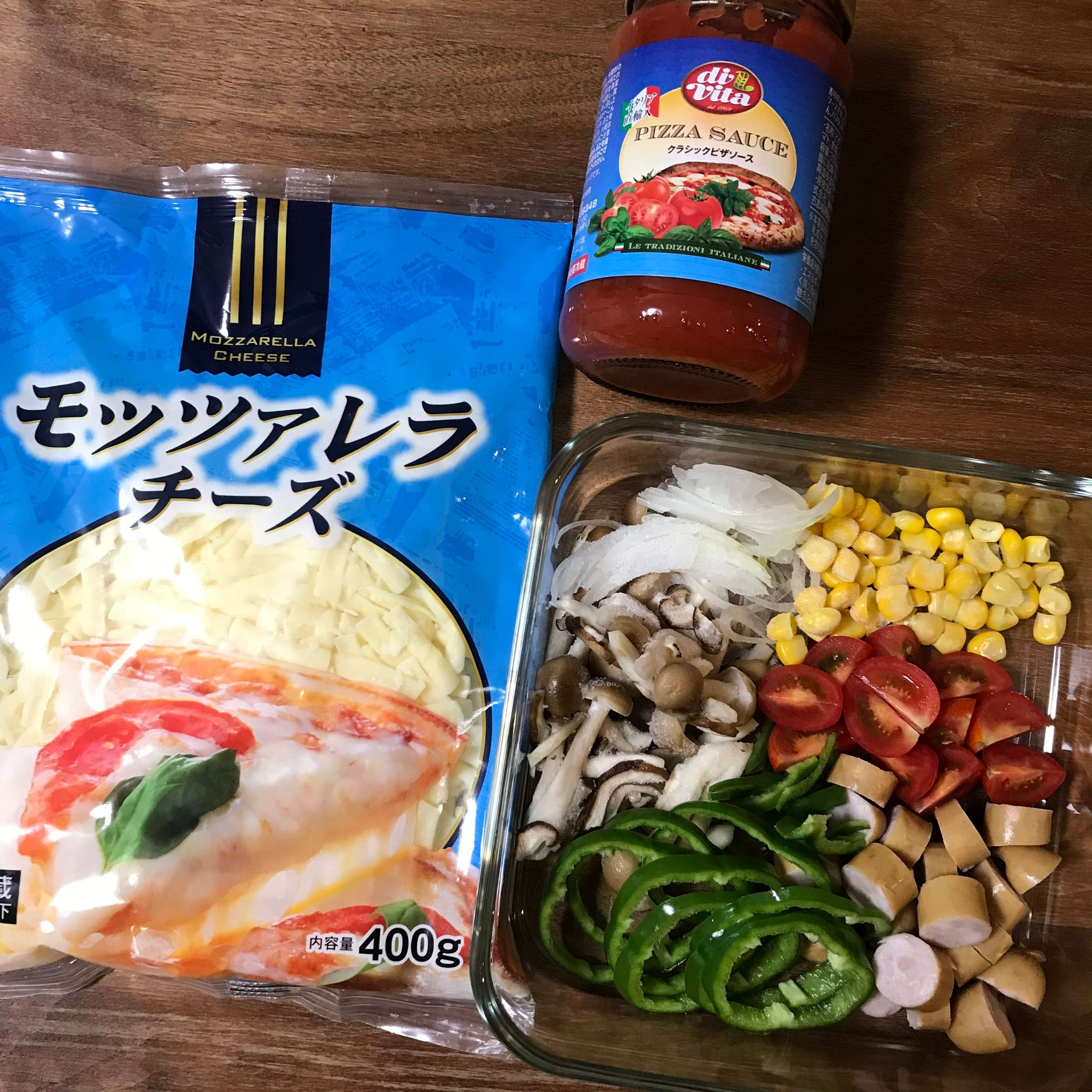 アレンジ1:ソースもチーズも業スーで!「ミックスピザ」