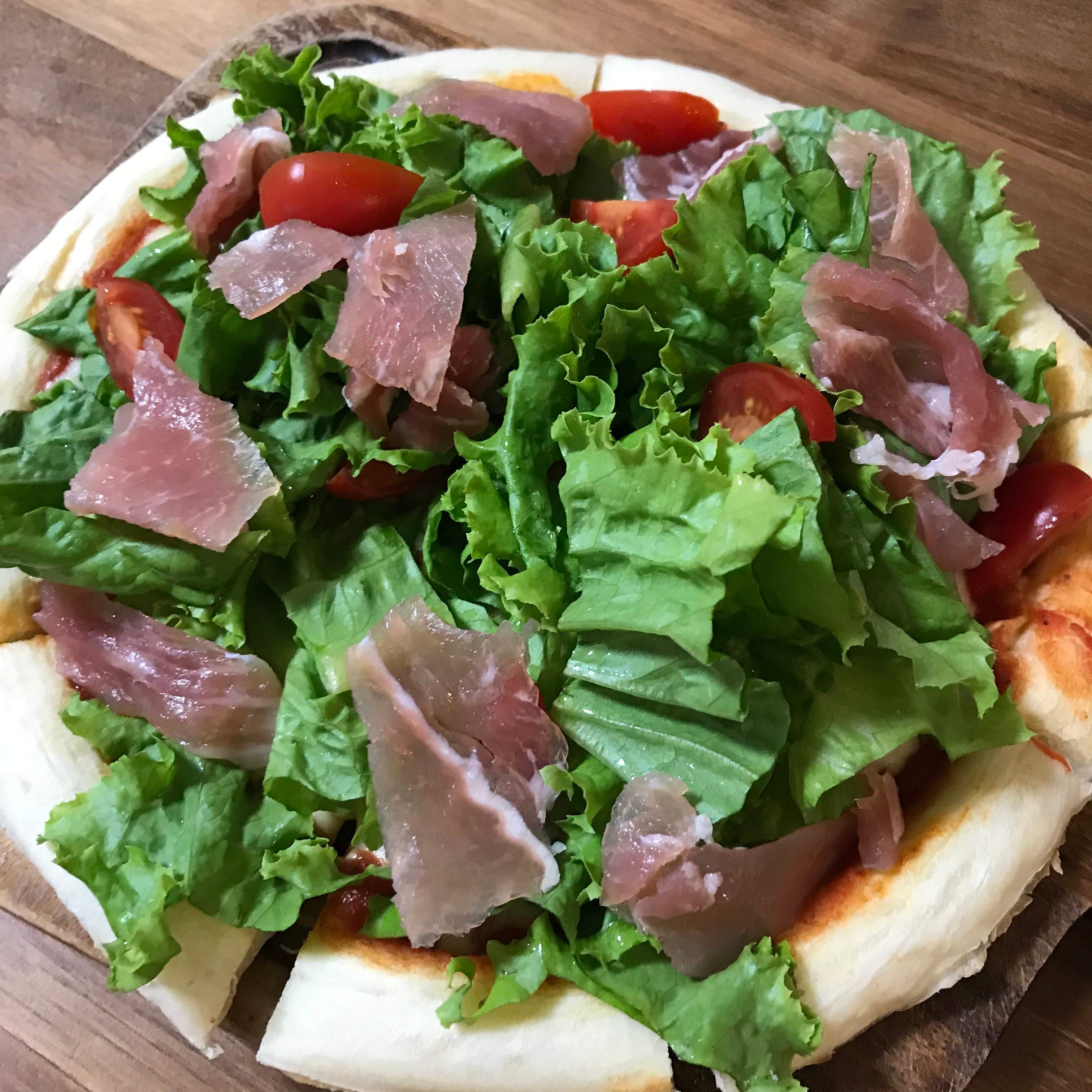 先ほどと同じくソースをぬってチーズをのせて、具なしの状態で焼き上げたピザの上にサラダをどっさり乗せただけ。今回は葉物野菜とカルディの生ハムのみで簡単に。オリーブオイルを上からかけていただきました。