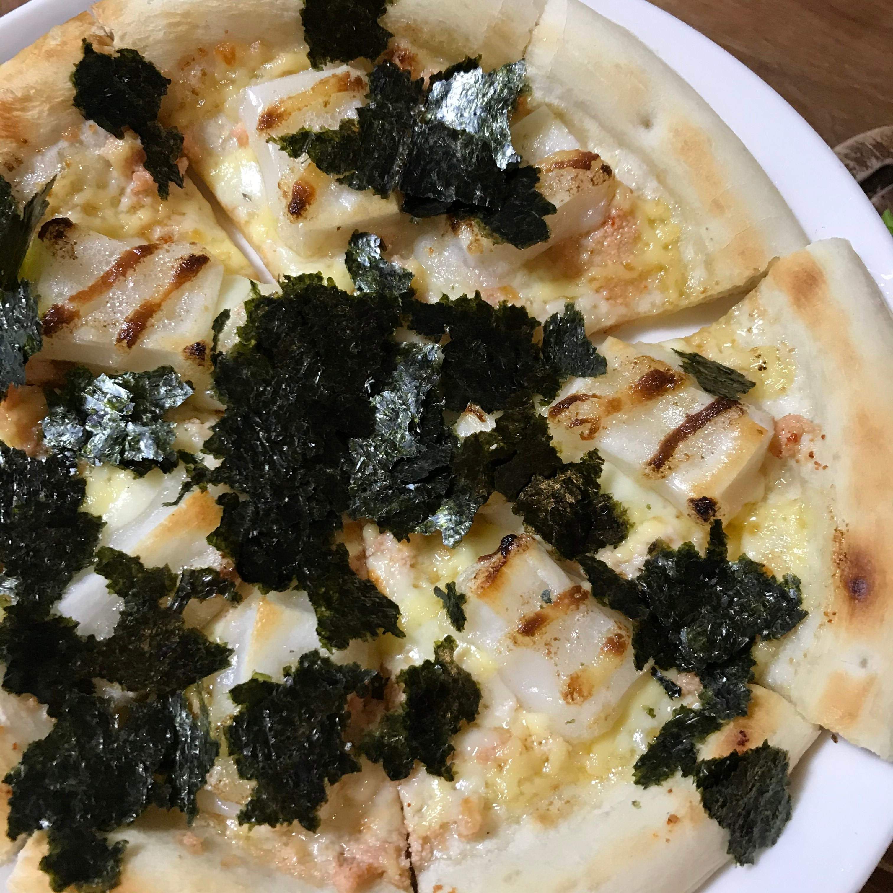 ピザ生地に明太子(ほぐしたもの)をサッと塗って、少しのチーズと小さく切った餅、マヨネーズを絞って焼きました。仕上げに海苔やネギなどをかけていただきます。大葉も合いそう~